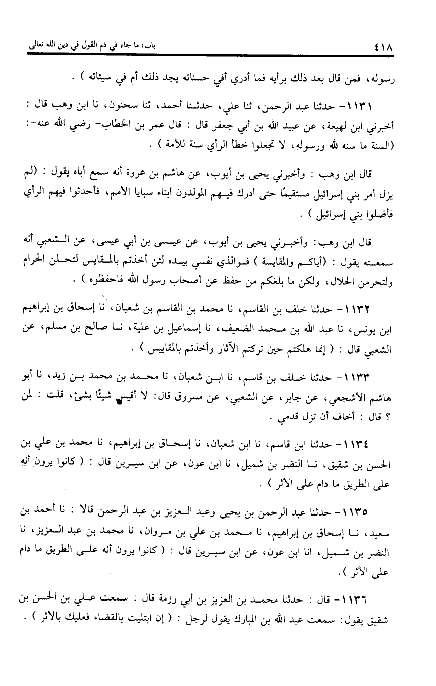 1132 - حدثنا خلف بن القاسم، نا محمد بن القاسم بن شعبان، نا إسحاق بن إبراهيم ابن يونس، نا عبد اللّه بن محمد الضعيف، نا إسماعيل بن علية، نا صالح بن مسلم، عن الشعبي قال: (إنما هلكتم حين تركتم الآثار وأخذتم بالمقاييس).