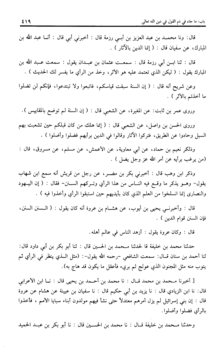 قال: ونا محمد بن عبد العزيز بن أبي رزمة قال: أخبرني أبي قال: أنا عبد اللّه بن المبارك، عن سفيان قال: (إنما الدين بالآثار).