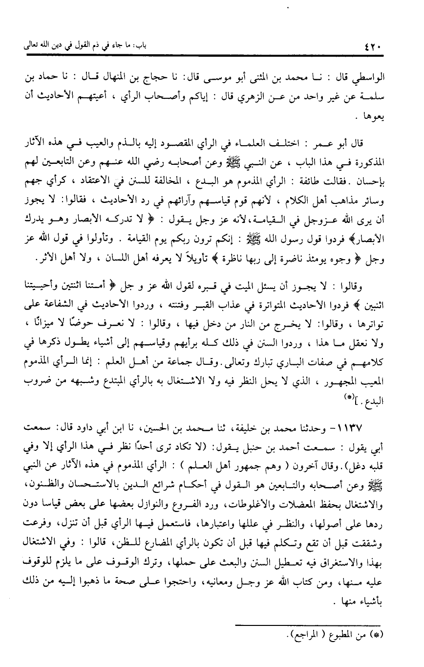 1137 - وحدثنا محمد بن خليفة، ثنا محمد بن الحسين، نا ابن أبي داود قال: سمعت أبي يقول: سمعت أحمد بن حنبل يقول: (لا تكاد ترى أحدا نظر في هذا الرأي إلا وفي قلبه دغل). وقال آخرون (و هم جمهور أهل العلم): الرأي المذموم في هذه الآثار عن النبي صلى اللّه عليه وسلم وعن أصحابه والتابعين هو القول في أحكام شرائع الدين بالاستحسان والظنون، والاشتغال بحفظ المعضلات والأغلوطات، ورد الفروع والنوازل بعضها على بعض قياسا دون ردها على أصولها، والنظر في عللها واعتبارها، فاستعمل فيها الرأي قبل أن تنزل، وفرعت وشققت قبل أن تقع وتكلم فيها قبل أن تكون بالرأي المضارع للظن، قالوا: وفي الاشتغال بهذا والاستغراق فيه تعطيل السنن والبعث على حملها، وترك الوقوف على ما يلزم للوقوف عليه منها، ومن كتاب اللّه عز وجل ومعانيه، واحتجوا على صحة ما ذهبوا إليه من ذلك بأشياء منها.
