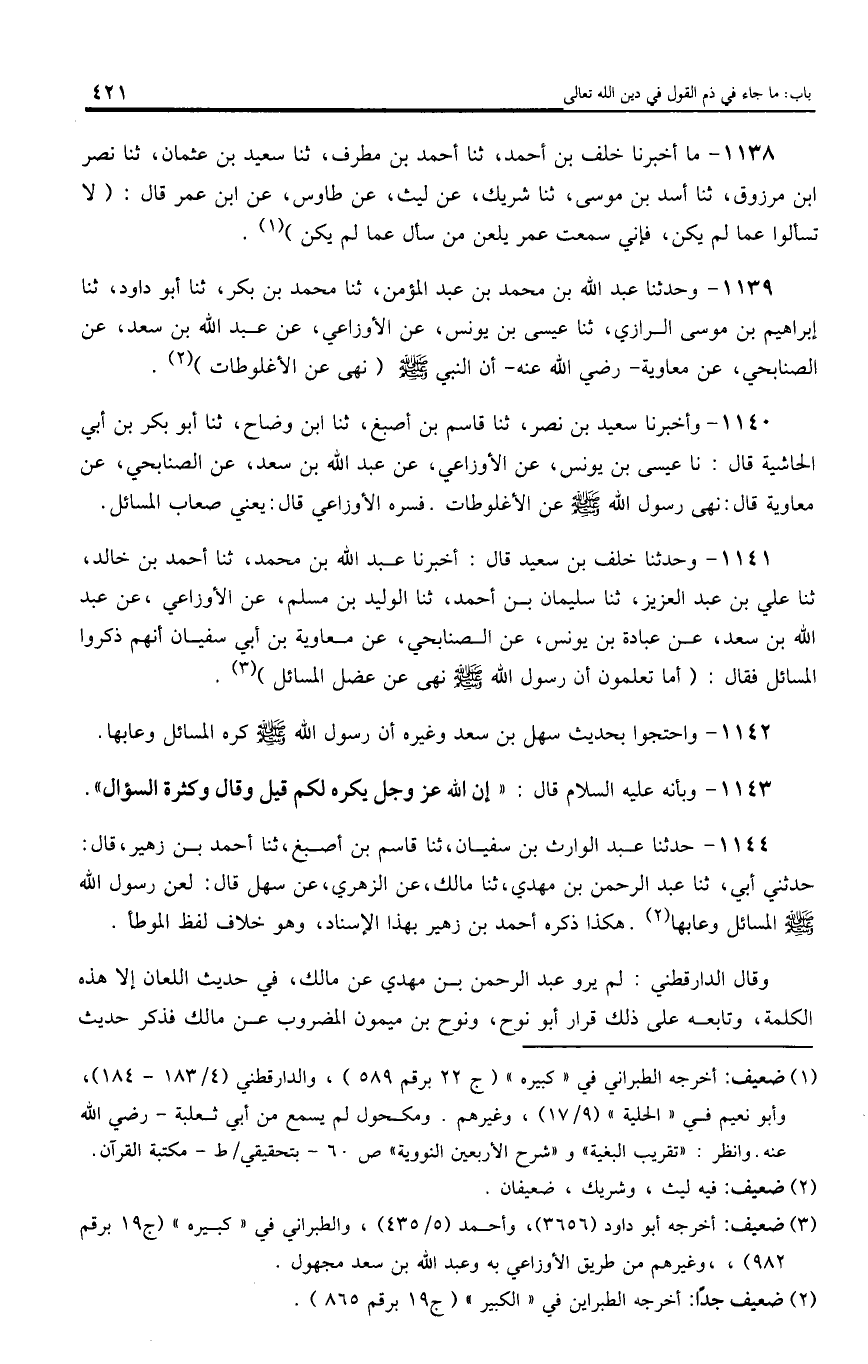 1138 - ما أخبرنا خلف بن أحمد، ثنا أحمد بن مطرف، ثنا سعيد بن عثمان، ثنا نصر ابن مرزوق، ثنا أسد بن موسى، ثنا شريك، عن ليث، عن طاوس، عن ابن عمر قال: (لا تسألوا عما لم يكن، فإني سمعت عمر يلعن من سأل عما لم يكن).