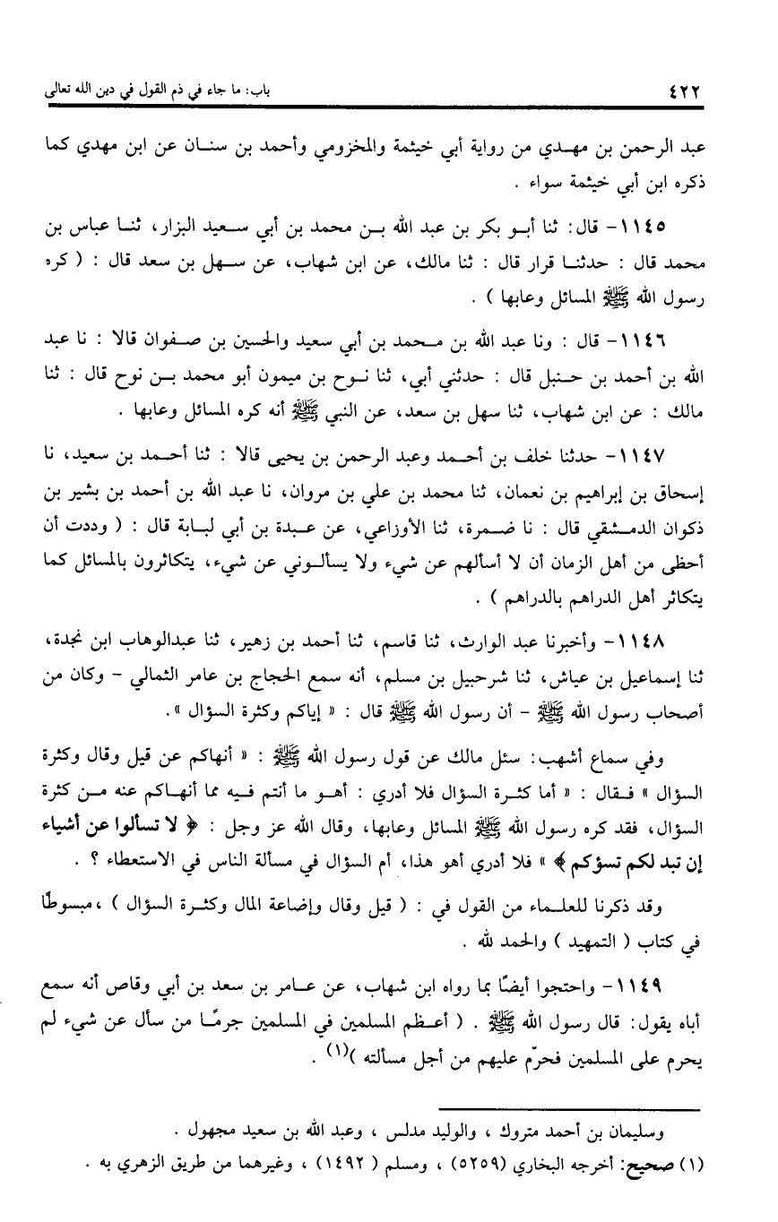 1146 - قال: ونا عبد اللّه بن محمد بن أبي سعيد والحسين بن صفوان قالا: نا عبد اللّه بن أحمد بن حنبل قال: حدثني أبي، ثنا نوح بن ميمون أبو محمد بن نوح قال: ثنا مالك: عن ابن شهاب، ثنا سهل بن سعد، عن النبي صلى اللّه عليه وسلم أنه كره المسائل وعابها.