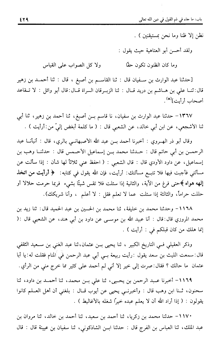 [حدثنا عبد الوارث بن سفيان قال: ثنا القاسم بن أصبغ، قال: ثنا أحمد بن زهير قال: ثنا علي بن هاشم بن دريد قال: ثنا الزبرقان السراة قال: قال أبو وائل: لا تقاعد أصحاب أ رأيت] (*).