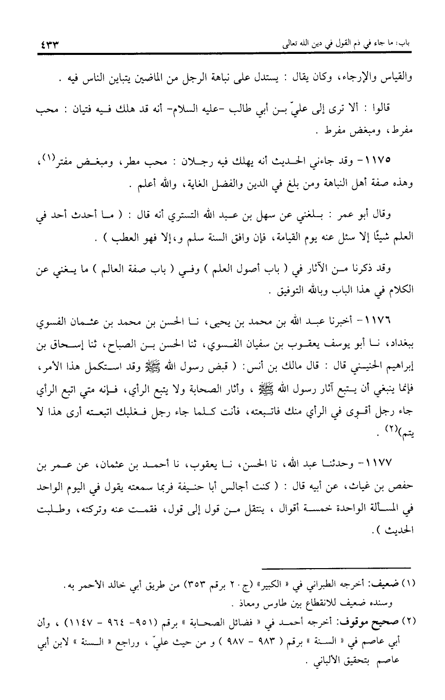 1175 - وقد جاءني الحديث أنه يهلك فيه رجلان: محب مطر، ومبغض مفتر، وهذه صفة أهل النباهة ومن بلغ في الدين والفضل الغاية، واللّه أعلم.