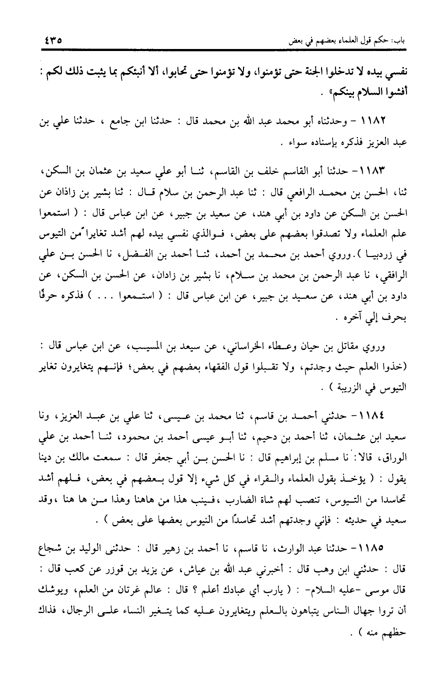1183 - حدثنا أبو القاسم خلف بن القاسم، ثنا أبو علي سعيد بن عثمان بن السكن، ثنا، الحسن بن محمد الرافعي قال: ثنا عبد الرحمن بن سلام قال: ثنا بشير بن زاذان عن الحسن بن السكن عن داود بن أبي هند، عن سعيد بن جبير، عن ابن عباس قال: (استمعوا علم العلماء ولا تصدقوا بعضهم على بعض، فو الذي نفسي بيده لهم أشد تغايرا من التيوس في زردبيا). وروي أحمد بن محمد بن أحمد، ثنا أحمد بن الفضل، نا الحسن بن علي الرافقي، نا عبد الرحمن بن محمد بن سلام، نا بشير بن زادان، عن الحسن بن السكن، عن داود بن أبي هند، عن سعيد بن جبير، عن ابن عباس قال: (استمعوا ... ) فذكره حرفا بحرف إلي آخره.