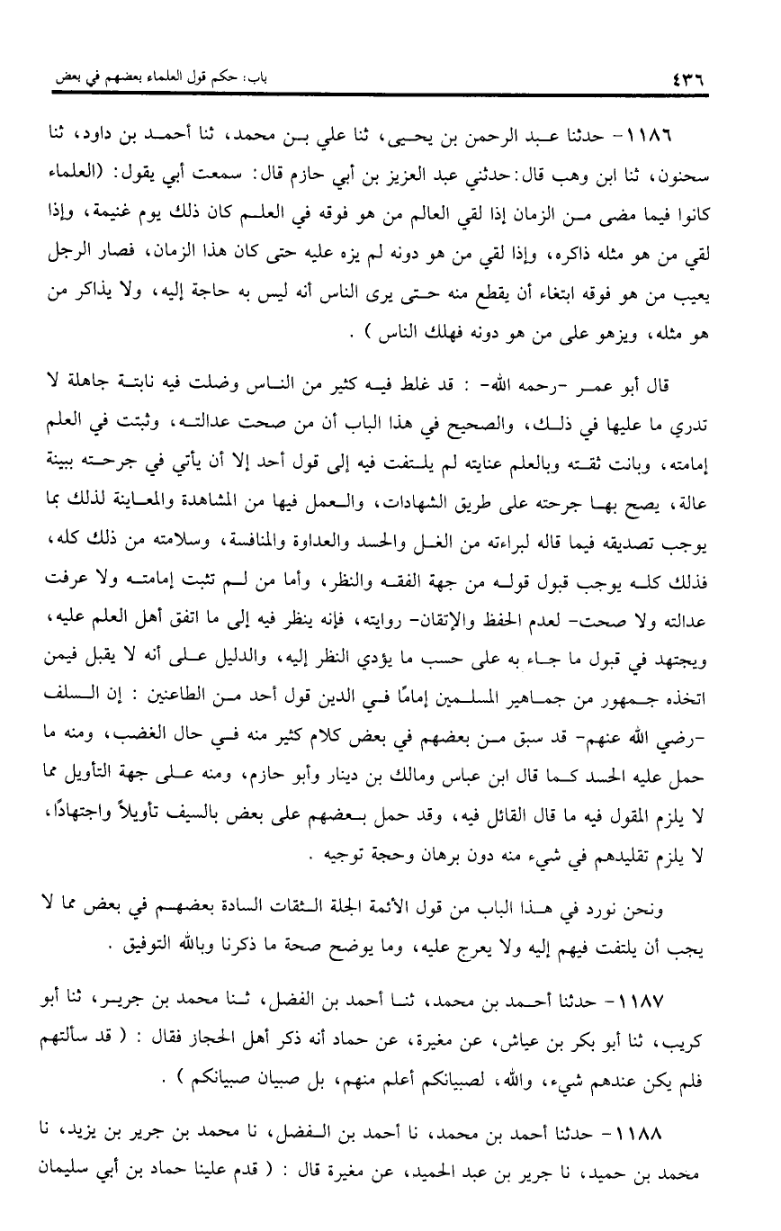 قال أبو عمر - رحمه اللّه -: قد غلط فيه كثير من الناس وضلت فيه نابتة جاهلة لا تدري ما عليها في ذلك، والصحيح في هذا الباب أن من صحت عدالته، وثبتت في العلم إمامته، وبانت ثقته وبالعلم عنايته لم يلتفت فيه إلى قول أحد إلا أن يأتي في جرحته ببينة عالة، يصح بها جرحته على طريق الشهادات، والعمل فيها من المشاهدة والمعاينة لذلك بما يوجب تصديقه فيما قاله لبراءته من الغل والحسد والعداوة والمنافسة، وسلامته من ذلك كله، فذلك كله يوجب قبول قوله من جهة الفقه والنظر، وأما من لم تثبت إمامته ولا عرفت عدالته ولا صحت - لعدم الحفظ والإتقان - روايته، فإنه ينظر فيه إلى ما اتفق أهل العلم عليه، ويجتهد في قبول ما جاء به على حسب ما يؤدي النظر إليه، والدليل على أنه لا يقبل فيمن اتخذه جمهور من جماهير المسلمين إماما في الدين قول أحد من الطاعنين: إن السلف - رضي اللّه عنهم - قد سبق من بعضهم في بعض كلام كثير منه في حال الغضب، ومنه ما حمل عليه الحسد كما قال ابن عباس ومالك بن دينار وأبو حازم، ومنه على جهة التأويل مما لا يلزم المقول فيه ما قال القائل فيه، وقد حمل بعضهم على بعض بالسيف تأويلا واجتهادا، لا يلزم تقليدهم في شيء منه دون برهان وحجة توجيه.