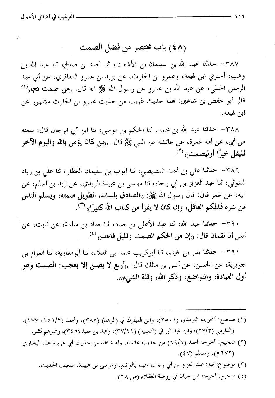 388 - حَدَّثَنَا عَبْدُ اللَّهِ بْنُ سُلَيْمَانَ بْنِ الْأَشْعَثِ، ثنا أَحْمَدُ بْنُ صَالِحٍ، ثنا عَبْدُ اللَّهِ بْنُ وَهْبٍ، أَخْبَرَنِي ابْنُ لَهِيعَةَ، وَعَمْرُو بْنُ الْحَارِثِ، عَنْ يَزِيدَ بْنِ عَمْرٍو الْمَعَافِرِيِّ، عَنْ أَبِي عَبْدِ الرَّحْمَنِ الْحُبُلِيِّ، عَنْ عَبْدِ اللَّهِ بْنِ عَمْرٍو، عَنْ رَسُولِ اللَّهِ صَلَّى اللَّهُ عَلَيْهِ وَسَلَّمَ أَنَّهُ قَالَ: «§مَنْ صَمَتَ نَجَا» قَالَ أَبُو حَفْصِ بْنُ شَاهِينَ: هَذَا حَدِيثٌ غَرِيبٌ مِنْ حَدِيثِ عَمْرِو بْنِ الْحَارِثِ مَشْهُورٌ عَنِ ابْنِ لَهِيعَةَ
