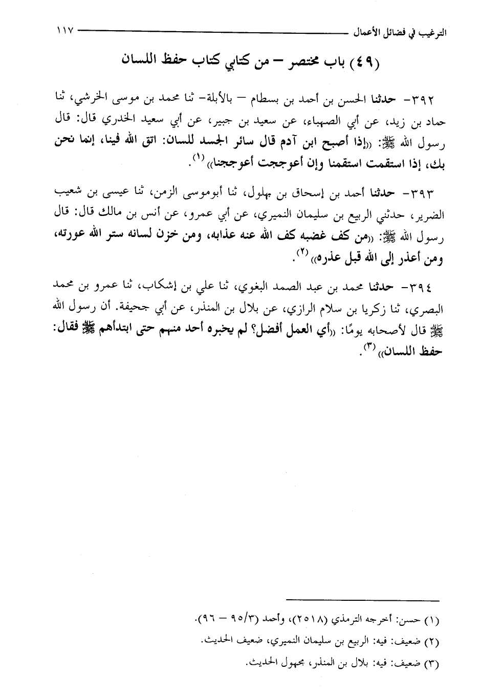 395 - حَدَّثَنَا مُحَمَّدُ بْنُ عَبْدِ الصَّمَدِ الْبَغَوِيُّ، ثنا عَلِيُّ بْنُ إِشْكَابَ، ثنا عَمْرُو بْنُ مُحَمَّدٍ الْبَصْرِيُّ، ثنا زَكَرِيَّا بْنُ سَلَّامٍ الرَّازِيُّ، عَنْ بِلَالِ بْنِ الْمُنْذِرِ، عَنْ أَبِي جُحَيْفَةَ، أَنَّ رَسُولَ اللَّهِ صَلَّى اللَّهُ عَلَيْهِ وَسَلَّمَ قَالَ لِأَصْحَابِهِ يَوْمًا: §" أَيُّ الْعَمَلِ أَفْضَلُ؟ لَمْ يُخْبِرْهُ أَحَدٌ مِنْهُمْ حَتَّى ابْتَدَأَهُمْ صَلَّى اللَّهُ عَلَيْهِ وَسَلَّمَ، فَقَالَ: حِفْظُ اللِّسَانِ "