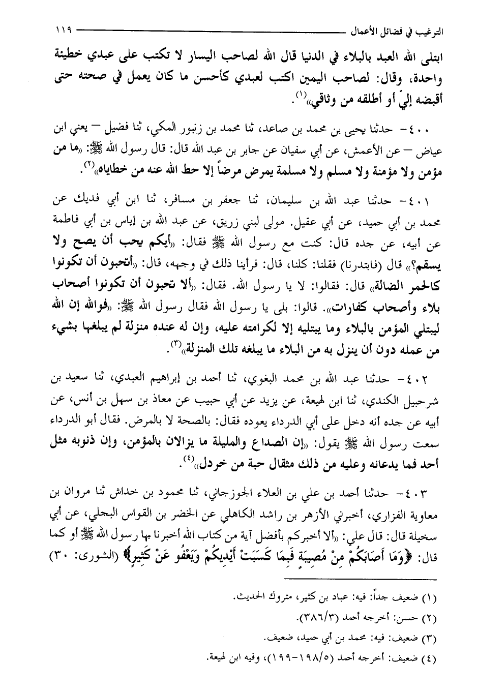 400 - حَدَّثَنَا يَحْيَى بْنُ مُحَمَّدِ بْنِ صَاعِدٍ، ثنا مُحَمَّدُ بْنُ زُنْبُورٍ الْمَكِّيُّ، ثنا فُضَيْلٌ - يَعْنِي ابْنَ عِيَاضٍ - عَنِ الْأَعْمَشِ، عَنْ أَبِي سُفْيَانَ، عَنْ جَابِرِ بْنِ عَبْدِ اللَّهِ، قَالَ: قَالَ رَسُولُ اللَّهِ: §«مَا مِنْ مُؤْمِنٍ وَلَا مُؤْمِنَةٍ وَلَا مُسْلِمٍ وَلَا مَسْلَمَةٍ يَمْرَضُ مَرَضًا إِلَّا حَطَّ اللَّهُ عَنْهُ مِنْ خَطَايَاهُ»