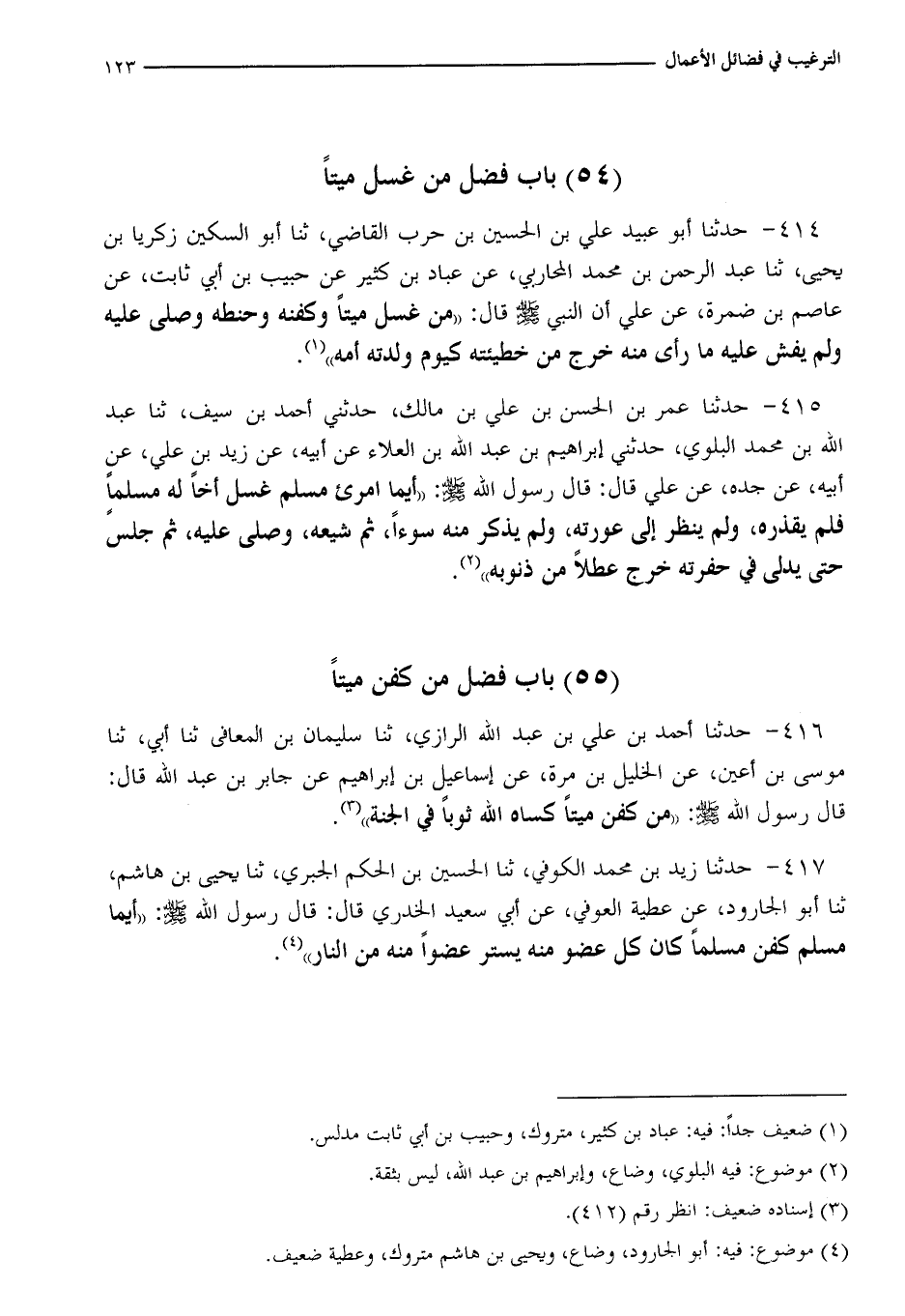 414 - حَدَّثَنَا أَبُو عُبَيْدٍ عَلِيُّ بْنُ الْحُسَيْنِ بْنِ حَرْبٍ الْقَاضِي، ثنا أَبُو السُّكَيْنِ زَكَرِيَّا بْنُ يَحْيَى، ثنا عَبْدُ الرَّحْمَنِ بْنُ مُحَمَّدٍ الْمُحَارِبِيُّ، عَنْ عَبَّادِ بْنِ كَثِيرٍ، عَنْ حَبِيبِ بْنِ أَبِي ثَابِتٍ، عَنْ عَاصِمِ بْنِ ضَمْرَةَ، عَنْ عَلِيٍّ، أَنَّ النَّبِيَّ صَلَّى اللَّهُ عَلَيْهِ وَسَلَّمَ قَالَ: §«مَنْ غَسَّلَ مَيِّتًا وَكَفَّنَهُ وَحَنَّطَهُ وَحَمَلَهُ وَصَلَّى عَلَيْهِ وَلَمْ يُفْشِ عَلَيْهِ مَا رَأَى مِنْهُ؛ خَرَجَ مِنْ خَطِيئَتِهِ كَيَوْمِ وَلَدَتْهُ أُمُّهُ»