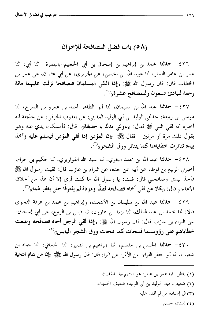 429 - حَدَّثَنَا عَبْدُ اللَّهِ بْنُ سُلَيْمَانَ بْنِ الْأَشْعَثِ، وَإِبْرَاهِيمُ بْنُ مُحَمَّدِ بْنِ عَرَفَةَ النَّحْوِيُّ، قَالَا: ثنا مُحَمَّدُ بْنُ عَبْدِ الْمَلِكِ، ثنا يَزِيدُ بْنُ هَارُونَ، ثنا قَيْسُ بْنُ الرَّبِيعِ، عَنْ أَبِي إِسْحَاقَ، عَنِ الْبَرَاءِ بْنِ عَازِبٍ، قَالَ: قَالَ رَسُولُ اللَّهِ صَلَّى اللَّهُ عَلَيْهِ وَسَلَّمَ: §«إِذَا لَقِيَ الرَّجُلُ أَخَاهُ فَصَافَحَهُ وُضِعَتْ خَطَايَاهُمَا عَلَى رُءُوسِهِمَا فَتَنْحَاتُّ كَمَا تَنْحَاتُّ وَرَقُ الشَّجَرِ الْيَابِسُ»
