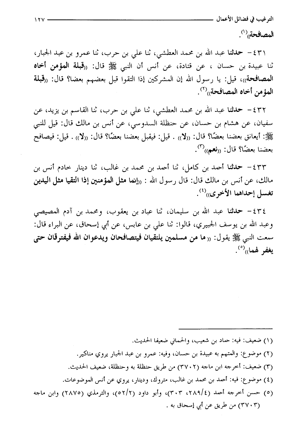 431 - حَدَّثَنَا عَبْدُ اللَّهِ بْنُ مُحَمَّدٍ الْعَطَشِيُّ ثنا عَلِيُّ بْنُ حَرْبٍ ثنا عَمْرُو بْنُ عَبْدِ الْجَبَّارِ، ثنا عُبَيْدَةُ بْنُ حَسَّانَ، عَنْ قَتَادَةَ، عَنْ أَنَسٍ، أَنَّ النَّبِيَّ صَلَّى اللَّهُ عَلَيْهِ وَسَلَّمَ قَالَ: «§قُبْلَةُ الْمُؤْمِنِ أَخَاهُ الْمُصَافَحَةُ» قِيلَ: يَا رَسُولَ اللَّهِ، إِنَّ الْمُشْرِكِينَ إِذَا الْتَقَوْا قَبَّلَ بَعْضَهُمْ بَعْضًا؟ قَالَ: «قُبْلَةُ الْمُسْلِمِ أَخَاهُ الْمُصَافَحَةُ»