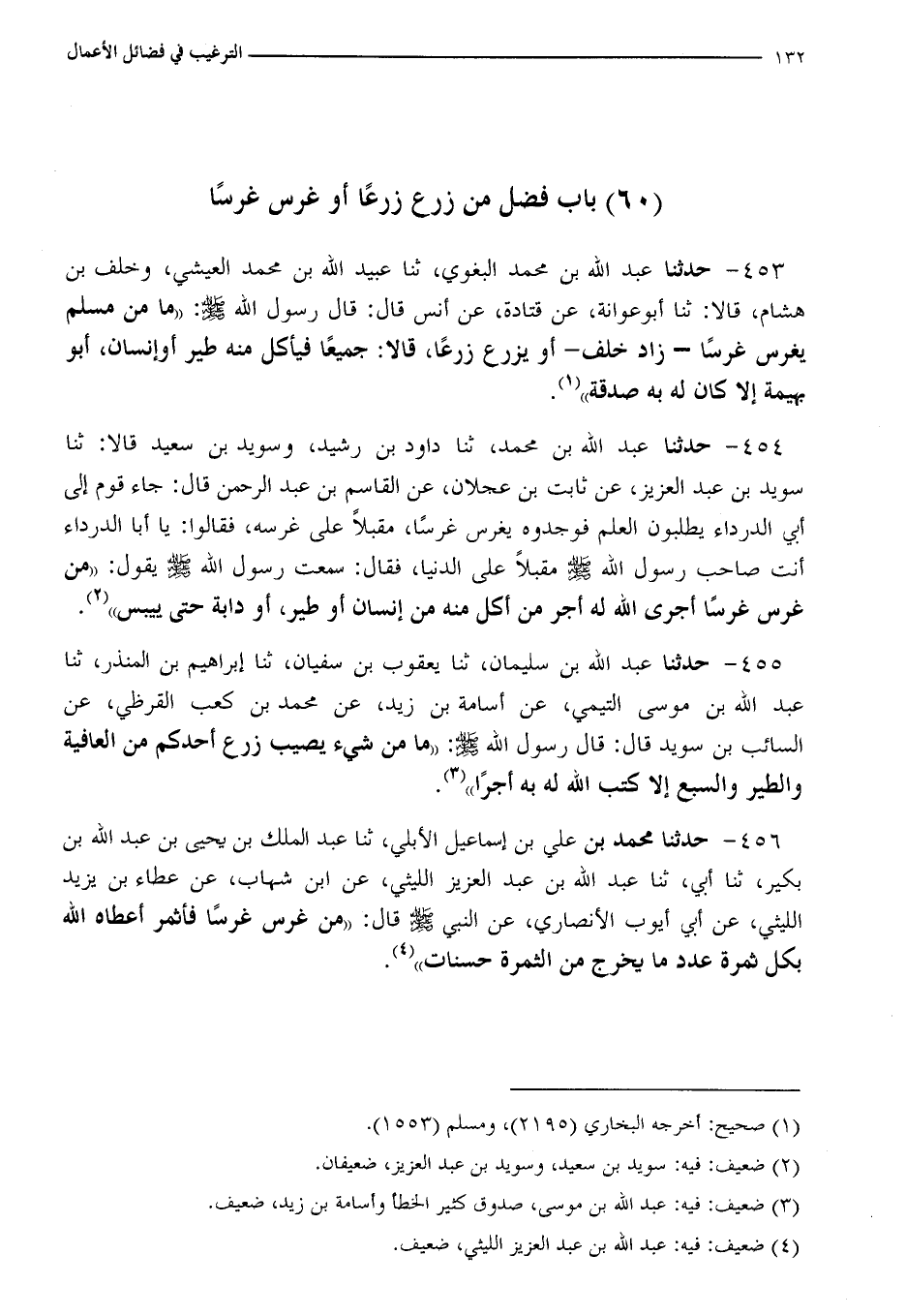 454 - حَدَّثَنَا عَبْدُ اللَّهِ بْنُ مُحَمَّدٍ، ثنا دَاوُدُ بْنُ رُشَيْدٍ، وَسُوَيْدُ بْنُ سَعِيدٍ، قَالَا: ثنا سُوَيْدُ بْنُ عَبْدِ الْعَزِيزِ، عَنْ ثَابِتِ بْنِ عَجْلَانَ، عَنِ الْقَاسِمِ بْنِ عَبْدِ الرَّحْمَنِ، قَالَ: جَاءَ قَوْمٌ إِلَى أَبِي الدَّرْدَاءِ يَطْلُبُونَ الْعِلْمَ، فَوَجَدُوهُ يَغْرِسُ غَرْسًا مُقْبِلًا عَلَى غَرْسِهِ، فَقَالُوا: يَا أَبَا الدَّرْدَاءِ، أَنْتَ صَاحِبُ رَسُولِ اللَّهِ صَلَّى اللَّهُ عَلَيْهِ وَسَلَّمَ مُقْبِلًا عَلَى الدُّنْيَا فَقَالَ: سَمِعْتُ رَسُولَ اللَّهِ صَلَّى اللَّهُ عَلَيْهِ وَسَلَّمَ يَقُولُ: §«مَنْ غَرَسَ غَرْسًا أَجْرَى اللَّهُ لَهُ أَجْرَ مَنْ أَكَلَ مِنْهُ مِنْ إِنْسَانٍ أَوْ طَيْرٍ أَوْ دَابَّةٍ حَتَّى يَيْبَسَ»