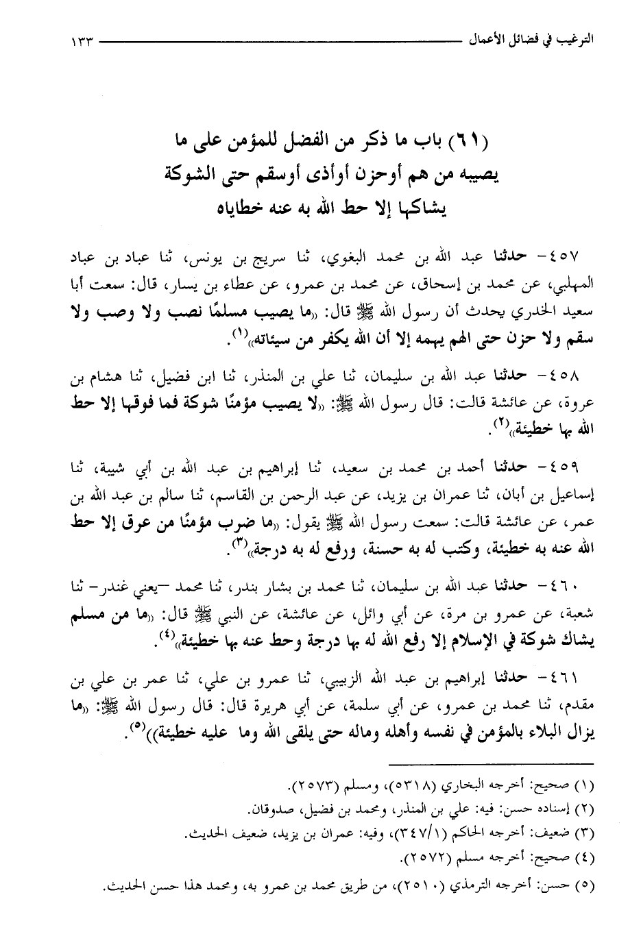 460 - حَدَّثَنَا عَبْدُ اللَّهِ بْنُ سُلَيْمَانَ، ثنا مُحَمَّدُ بْنُ بَشَّارٍ بُنْدَارٌ، ثنا مُحَمَّدٌ يَعْنِي غُنْدَرًا، ثنا شُعْبَةُ، عَنْ عَمْرِو بْنِ مُرَّةَ، عَنْ أَبِي وَائِلٍ، عَنْ عَائِشَةَ، عَنِ النَّبِيِّ صَلَّى اللَّهُ عَلَيْهِ وَسَلَّمَ قَالَ: §«مَا مِنْ مُسْلِمٍ يُشَاكُ شَوْكَةً فِي الْإِسْلَامِ إِلَّا رَفَعَ اللَّهُ لَهُ بِهَا دَرَجَةً، وَحَطَّ عَنْهُ بِهَا خَطِيئَةً»