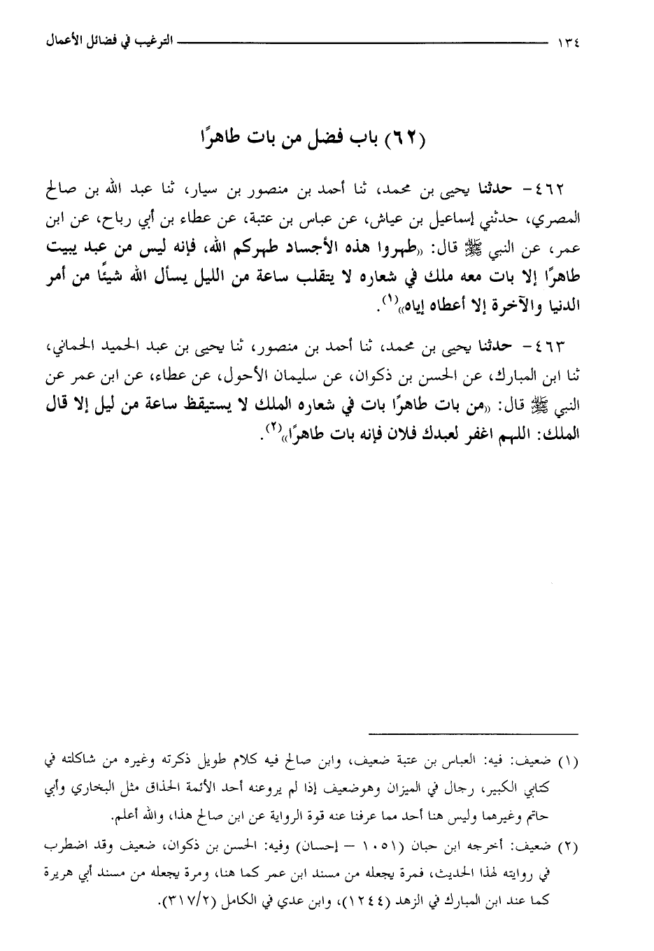 462 - حَدَّثَنَا يَحْيَى بْنُ مُحَمَّدٍ، ثنا أَحْمَدُ بْنُ مَنْصُورِ بْنِ سَيَّارٍ، ثنا عَبْدُ اللَّهِ بْنُ صَالِحٍ الْمِصْرِيُّ، حَدَّثَنِي إِسْمَاعِيلُ بْنُ عَيَّاشٍ، عَنْ عَبَّاسِ بْنِ عُتْبَةَ، عَنْ عَطَاءِ بْنِ أَبِي رَبَاحٍ، عَنِ ابْنِ عُمَرَ، عَنِ النَّبِيِّ صَلَّى اللَّهُ عَلَيْهِ وَسَلَّمَ قَالَ: «§طَهِّرُوا هَذِهِ الْأَجْسَادِ طَهَّرَكُمُ اللَّهُ، فَإِنَّهُ لَيْسَ مِنْ عَبْدٍ يَبِيتُ طَاهِرًا إِلَّا بَاتَ مَعَهُ مَلَكٌ فِي شِعَارِهِ لَا يَتَقَلَّبُ سَاعَةً مِنَ اللَّيْلِ يَسْأَلُ اللَّهَ شَيْئًا مِنْ أَمْرِ الدُّنْيَا وَالْآخِرَةِ إِلَّا أَعْطَاهُ إِيَّاهُ»