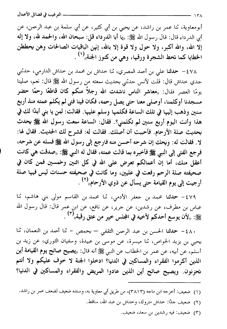 478 - حَدَّثَنَا عَلِيُّ بْنُ أَحْمَدَ الْمِصْرِيُّ، ثنا خِدَاشُ بْنُ مُحَمَّدِ بْنِ خِدَاشٍ الدَّارِمِيُّ، حَدَّثَنِي جَدِّي، خِدَاشٌ، قَالَ: قُلْتُ لِأَنَسٍ: حَدِّثْنِي بِحَدِيثٍ، سَمِعْتَهُ مِنْ رَسُولِ اللَّهِ. قَالَ: نَعَمْ، صَلَّيْنَا يَوْمًا الْعَصْرَ، فَقَالَ: " مَعَاشِرَ النَّاسِ، نَاشَدْتُ اللَّهَ رَجُلًا مِنْكُمْ كَانَ قَاطِعًا رَحِمًا حَضَرَ مَسْجِدَنَا أَوْ كَلَّمَنَا أَوْ صَلَّى مَعَنَا حَتَّى يَصِلَ رَحِمَهُ. فَكَانَ فِينَا فَتًى لَمْ يُكَلِّمْ عَمَّتَهُ مُنْذُ أَرْبَعِ سِنِينَ، وَذَهَبَ إِلَيْهَا فِي تِلْكَ السَّاعَةِ فَكَلَّمَهَا وَسَلَّمَ عَلَيْهَا، فَقَالَتْ: لَمَنْ يَا بُنَيَّ أَبْدَا لَكَ فِي هَذَا وَأَنْتَ الْيَوْمَ أَرْبَعَ سِنِينَ لَمْ تُكَلِّمْنِي؟ فَقَالَ: السَّاعَةَ سَمِعْتُ رَسُولَ اللَّهِ صَلَّى اللَّهُ عَلَيْهِ وَسَلَّمَ يُحَدِّثُ بِحَدِيثِ صِلَةِ الْأَرْحَامِ، فَأَحْبَبْتُ أَنْ أَصِلَكِ. فَقَالَتْ لَهُ: فَشَرَحَ لَكَ الْحَدِيثَ. فَقَالَ لَهَا: لَا. فَقَالَتْ لَهُ: وَيْحَكَ إِنَّ شَرْحَهُ أَحْسَنُ مِنْهُ، فَارْجِعْ إِلَى رَسُولِ اللَّهِ صَلَّى اللَّهُ عَلَيْهِ وَسَلَّمَ فَسَلْهُ عَنْ شَرْحِهِ. فَرَجَعَ الْفَتَى إِلَى النَّبِيِّ صَلَّى اللَّهُ عَلَيْهِ وَسَلَّمَ فَأَخْبَرَهُ بِمَا قَالَتْ عَمَّتُهُ، فَقَالَ لَهُ النَّبِيُّ صَلَّى اللَّهُ عَلَيْهِ وَسَلَّمَ: «صَدَقَتْ، هِيَ كَانَتْ أَعْقَلَ مِنْكَ، أَمَا إِنَّ §أَعْمَالَكُمْ تُعْرَضُ عَلَى اللَّهِ فِي كُلِّ اثْنَيْنِ وَخَمِيسٍ، فَمَنْ كَانَ فِي صَحِيفَتِهِ صِلَةُ الرَّحِمِ رُفِعَتْ فِي عِلِّيِّينَ، وَمَنْ كَانَتْ فِي صَحِيفَتِهِ حَسَنَاتٌ لَيْسَ فِيهَا صِلَةُ رَحِمٍ أُرْجِيَتْ إِلَى يَوْمِ الْقِيَامَةِ حَتَّى يُسْأَلَ عَنْ ذَوِي الْأَرْحَامِ»