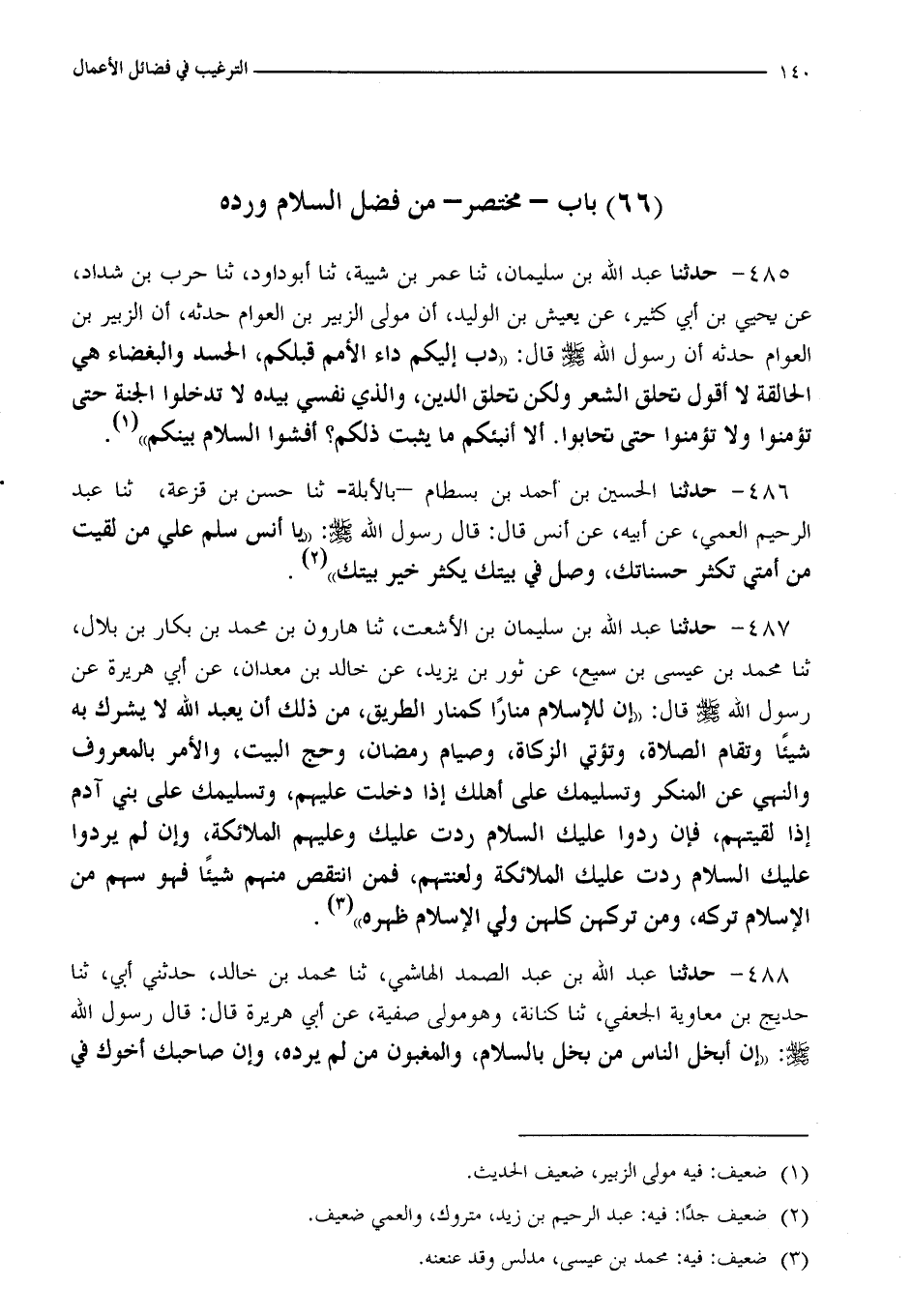 487 - حَدَّثَنَا عَبْدُ اللَّهِ بْنُ سُلَيْمَانَ بْنِ الْأَشْعَثِ، ثنا هَارُونُ بْنُ مُحَمَّدِ بْنِ بَكَّارِ بْنِ بِلَالٍ، ثنا مُحَمَّدُ بْنُ عِيسَى بْنِ سُمَيْعٍ، عَنْ ثَوْرِ بْنِ يَزِيدَ، عَنْ خَالِدِ بْنِ مَعْدَانَ، عَنْ أَبِي هُرَيْرَةَ، عَنْ رَسُولِ اللَّهِ صَلَّى اللَّهُ عَلَيْهِ وَسَلَّمَ قَالَ: «إِنَّ §لِلْإِسْلَامِ مَنَارًا كَمَنَارِ الطَّرِيقِ، مِنْ ذَلِكَ أَنْ يُعْبَدَ اللَّهُ لَا يُشْرَكُ بِهِ شَيْئًا، وَتُقَامَ الصَّلَاةَ، وَتُوْتَى الزَّكَاةُ، وَصِيَامُ رَمَضَانَ، وَحَجُّ الْبَيْتِ، وَالْأَمْرُ بِالْمَعْرُوفِ وَالنَّهْيُ عَنِ الْمُنْكَرِ، وَتَسْلِيمُكَ عَلَى أَهْلِكَ إِذَا دَخَلْتَ عَلَيْهِمْ، وَتَسْلِيمُكَ عَلَى بَنِي آدَمَ إِذَا لَقِيتَهُمْ، فَإِنْ رَدُّوا عَلَيْكَ السَّلَامَ رَدَّتْ عَلَيْكَ وَعَلَيْهِمُ الْمَلَائِكَةُ، وَإِنْ لَمْ يَرُدُّوا عَلَيْكَ السَّلَامَ رَدَّتْ عَلَيْكَ الْمَلَائِكَةُ وَلَعَنَتْهُمْ، فَمَنِ انْتَقَصَ مِنْهُمْ شَيْئًا فَهُوَ سَهْمٌ مِنَ الْإِسْلَامِ تَرَكَهُ، وَمَنْ تَرَكَهُنَّ كُلَّهُنَّ وَلَّى الْإِسْلَامَ ظَهْرَهُ»