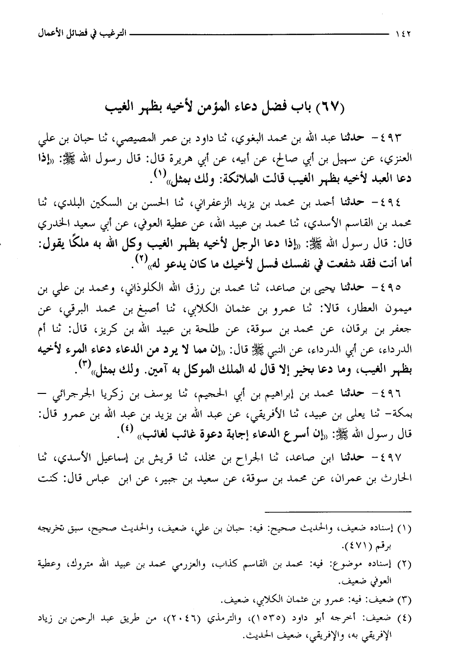 493 - حَدَّثَنَا عَبْدُ اللَّهِ بْنُ مُحَمَّدٍ الْبَغَوِيُّ، ثنا دَاوُدُ بْنُ عَمْرٍو الضَّبِيُّ، ثنا حَبَّانُ بْنُ عَلِيٍّ الْعَنَزِيُّ، عَنْ سُهَيْلِ بْنِ أَبِي صَالِحٍ، عَنْ أَبِيهِ، عَنْ أَبِي هُرَيْرَةَ، قَالَ: قَالَ رَسُولُ اللَّهِ صَلَّى اللَّهُ عَلَيْهِ وَسَلَّمَ: " §إِذَا دَعَا الْعَبْدُ لِأَخِيهِ بِظَهْرِ الْغَيْبِ قَالَتِ الْمَلَائِكَةُ: وَلَكَ بِمِثْلٍ "