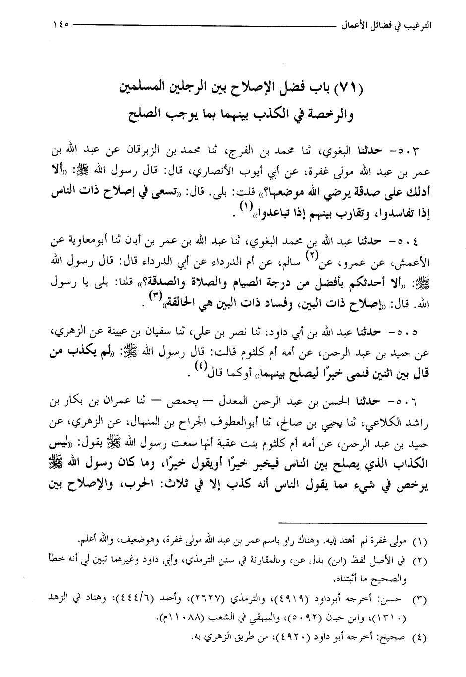 503 - حَدَّثَنَا الْبَغَوِيُّ، ثنا مُحَمَّدُ بْنُ الْفَرَجِ، ثنا مُحَمَّدُ بْنُ الزِّبْرِقَانِ، عَنْ عَبْدِ اللَّهِ بْنِ عَمْرِو بْنِ عَبْدِ اللَّهِ، مَوْلَى عُفْرَةَ، عَنْ أَبِي أَيُّوبَ الْأَنْصَارِيِّ، قَالَ: قَالَ رَسُولُ اللَّهِ صَلَّى اللَّهُ عَلَيْهِ وَسَلَّمَ: «أَلَا أَدُلُّكَ عَلَى صَدَقَةٍ يَرْضَى اللَّهُ مَوْضِعَهَا؟» قُلْتُ: بَلَى. قَالَ: «§تَسْعَى فِي إِصْلَاحِ ذَاتِ النَّاسِ إِذَا تَفَاسَدُوا، وَتُقَارِبُ بَيْنَهُمْ إِذَا تَبَاعَدُوا»