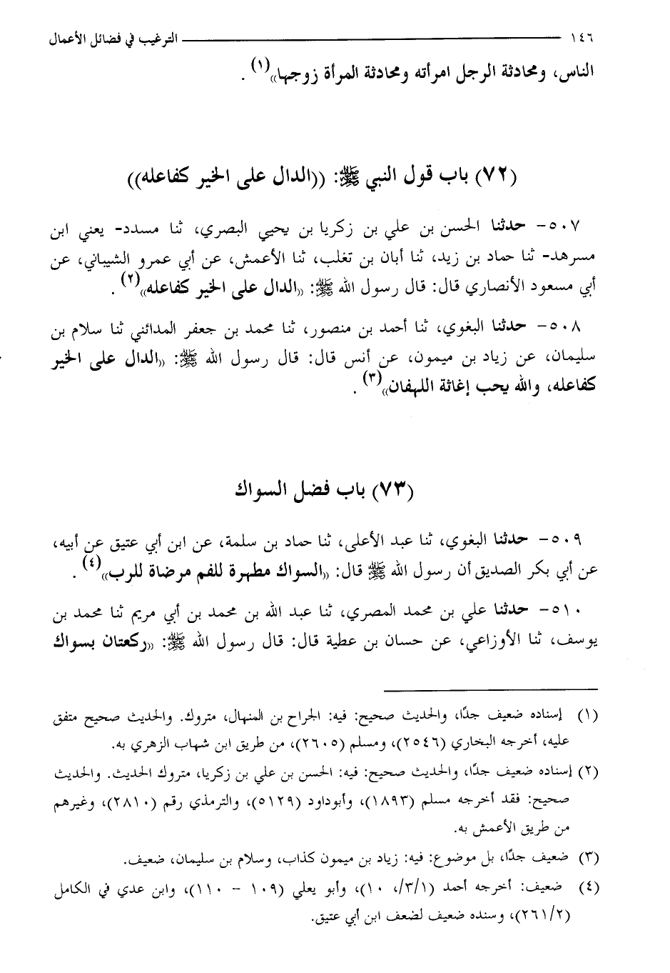 510 - حَدَّثَنَا عَلِيُّ بْنُ مُحَمَّدٍ الْمِصْرِيُّ، ثنا عَبْدُ اللَّهِ بْنُ مُحَمَّدِ بْنِ أَبِي مَرْيَمَ، ثنا مُحَمَّدُ بْنُ يُوسُفَ، ثنا الْأَوْزَاعِيُّ، عَنْ حَسَّانَ بْنِ عَطِيَّةَ، قَالَ: قَالَ رَسُولُ اللَّهِ صَلَّى اللَّهُ عَلَيْهِ وَسَلَّمَ: «§رَكْعَتَانِ بِسِوَاكٍ -[147]- فِيهِمَا أَفْضَلُ مِنْ سَبْعِينَ رَكْعَةً بِغَيْرِ سِوَاكٍ، وَالسِّوَاكُ شَطْرُ الْوُضُوءِ , وَالْوُضُوءُ شَطْرُ الْإِيمَانِ»
