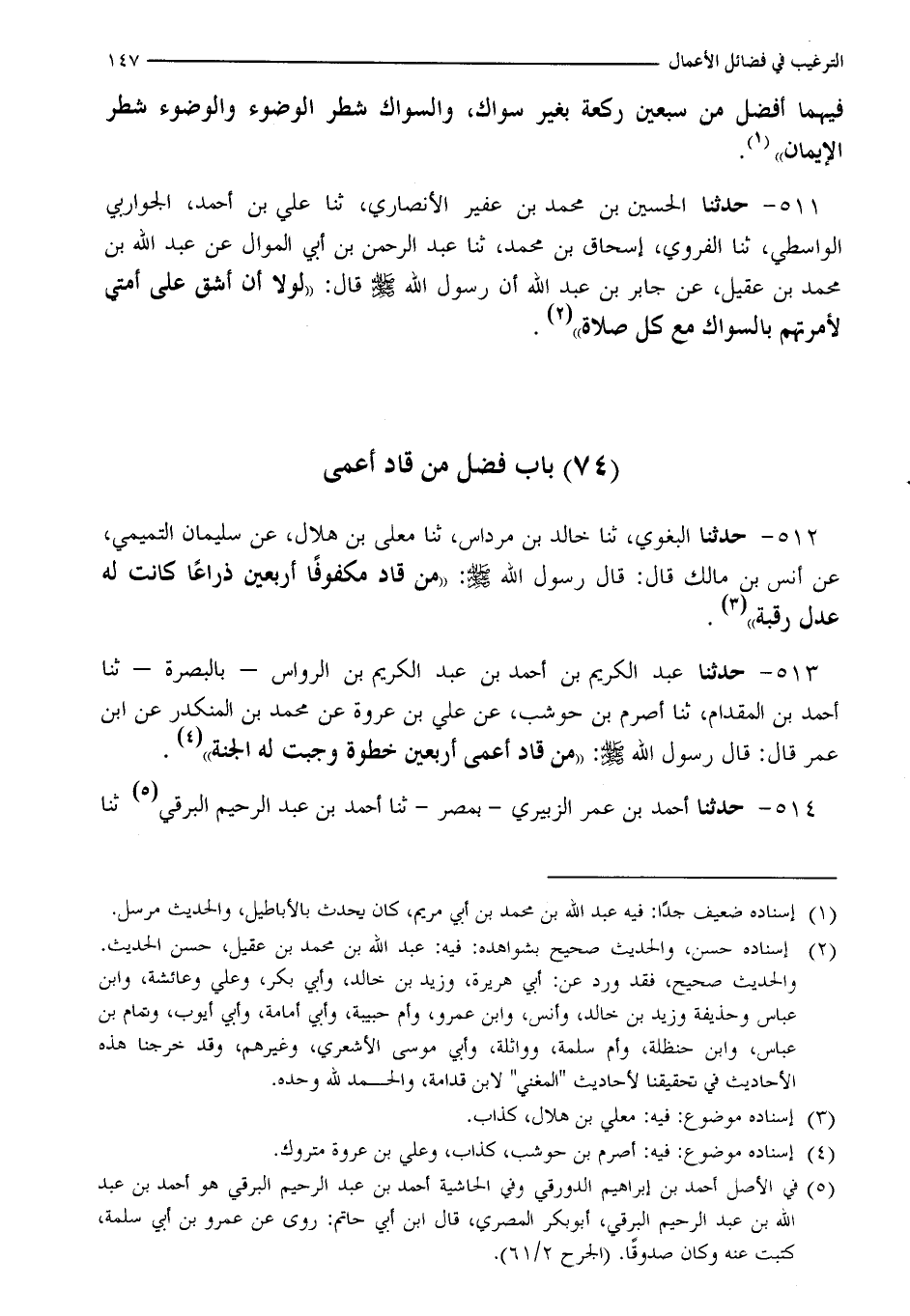 512 - حَدَّثَنَا الْبَغَوِيُّ، ثنا خَالِدُ بْنُ مِرْدَاسٍ، ثنا مُعَلَّى بْنُ هِلَالٍ، عَنْ سُلَيْمَانَ التَّيْمِيِّ، عَنْ أَنَسِ بْنِ مَالِكٍ، قَالَ: قَالَ رَسُولُ اللَّهِ صَلَّى اللَّهُ عَلَيْهِ وَسَلَّمَ: §«مَنْ قَادَ مَكْفُوفًا أَرْبَعِينَ ذِرَاعًا كَانَتْ لَهُ عَدْلُ رَقَبَةٍ»