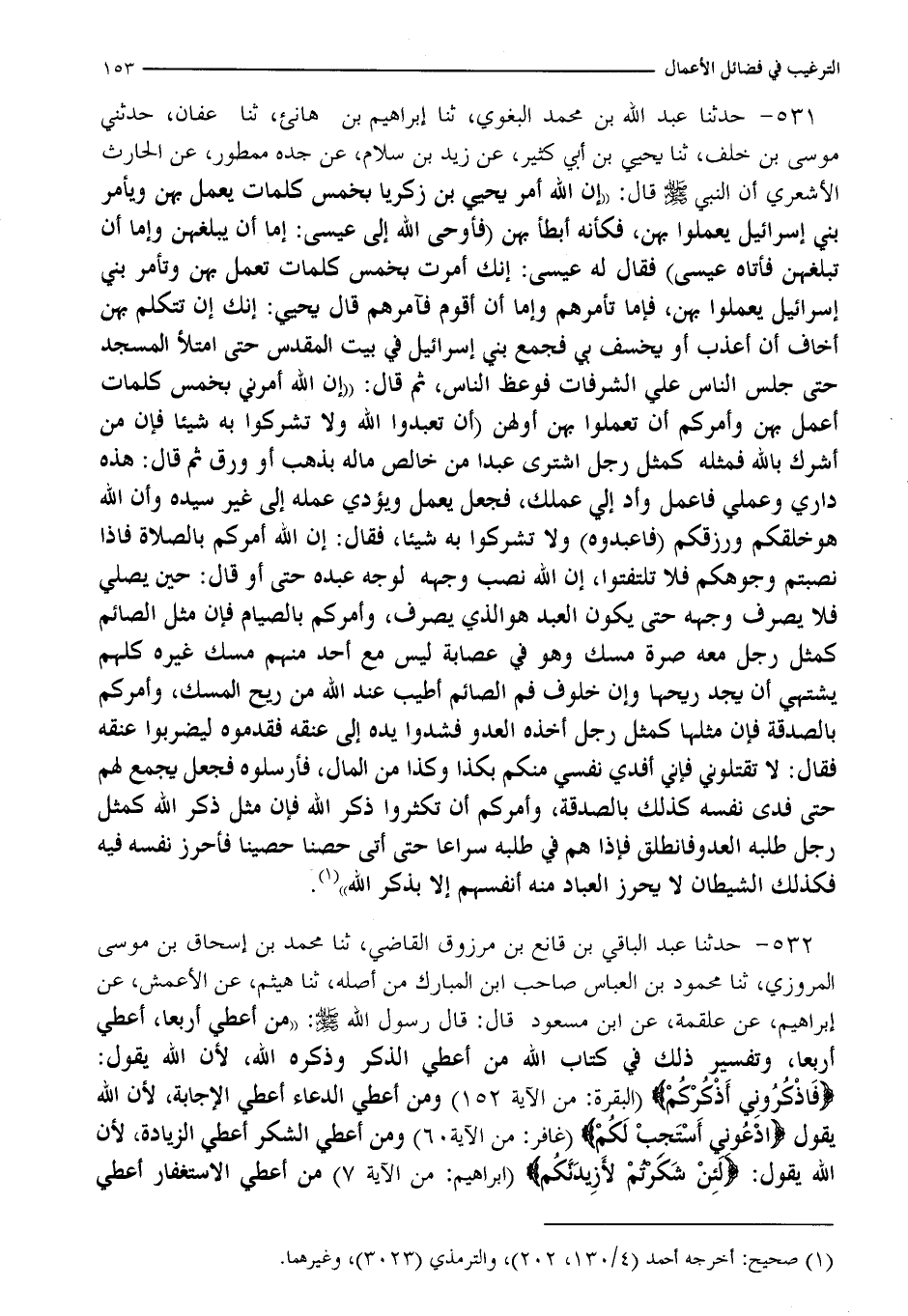 531 - حَدَّثَنَا عَبْدُ اللَّهِ بْنُ مُحَمَّدٍ الْبَغَوِيُّ، ثنا إِبْرَاهِيمُ بْنُ هَانِئٍ، ثنا عَفَّانُ، حَدَّثَنِي مُوسَى بْنُ خَلَفٍ، ثنا يَحْيَى بْنُ أَبِي كَثِيرٍ، عَنْ زَيْدِ بْنِ سَلَّامٍ، عَنْ جَدِّهِ مَمْطُورٍ، عَنِ الْحَارِثِ الْأَشْعَرِيِّ، أَنَّ النَّبِيَّ صَلَّى اللَّهُ عَلَيْهِ وَسَلَّمَ قَالَ: " إِنَّ اللَّهَ أَمَرَ يَحْيَى بْنَ زَكَرِيَّا بِخَمْسِ كَلِمَاتٍ يَعْمَلُ بِهِنَّ وَيَأْمُرُ بَنِي إِسْرَائِيلَ يَعْمَلُوا بِهِنَّ، فَكَأَنَّهُ أَبْطَأَ بِهِنَّ , فَأَوْحَى اللَّهُ إِلَى عِيسَى: إِمَّا أَنْ يُبَلِّغَهُنَّ وَإِمَّا أَنْ تُبَلِّغَهُنَّ , فَأَتَاهُ عِيسَى فَقَالَ لَهُ عِيسَى: إِنَّكَ أُمِرْتَ بِخَمْسِ كَلِمَاتٍ تَعْمَلُ بِهِنَّ وَتَأْمُرُ بَنِي إِسْرَائِيلَ يَعْمَلُوا بِهِنَّ، فَإِمَّا تَأْمُرَهُمْ وَإِمَّا أَنْ أَقُومَ فَآمُرَهُمْ، قَالَ يَحْيَى: إِنَّكَ إِنْ تَتَكَلَّمْ بِهِنَّ أَخَافُ أَنْ أَعَذَّبَ أَوْ يُخْسَفَ بِي , فَجَمَعَ بَنِي إِسْرَائِيلَ فِي بَيْتِ الْمَقْدِسِ حَتَّى امْتَلَأَ الْمَسْجِدُ , حَتَّى جَلَسَ النَّاسُ عَلَى الشُّرُفَاتِ فَوَعَظَ النَّاسَ، ثُمَّ قَالَ: " إِنَّ اللَّهَ أَمَرَنِي بِخَمْسِ كَلِمَاتٍ أَعْمَلُ بِهِنَّ وَآمُرُكُمْ أَنْ تَعَمَلُوا بِهِنَّ , أَوَّلُهُنَّ: أَنْ §تَعْبُدُوا اللَّهَ وَلَا تُشْرِكُوا بِهِ شَيْئًا، فَإِنَّ مَنْ أَشْرَكَ بِاللَّهِ فَمَثَلُهُ كَمَثَلِ رَجُلٍ اشْتَرَى عَبْدًا مِنْ خَالِصِ مَالِهِ بِذَهَبٍ أَوْ وَرِقٍ ثُمَّ قَالَ: هَذِهِ دَارِي وَعَمَلِي فَاعْمَلْ وَأَدِّ إِلَيَّ عَمَلِكَ، فَجَعَلَ يَعْمَلُ وَيُؤَدِّي عَمَلَهُ إِلَى غَيْرِ سَيِّدِهِ , وَأَنَّ اللَّهَ هُوَ خَلَقَكُمْ وَرَزَقَكُمْ فَاعْبُدُوهُ وَلَا تُشْرِكُوا بِهِ شَيْئًا، فَقَالَ: إِنَّ اللَّهَ أَمَرَكُمْ بِالصَّلَاةِ , فَإِذَا نَصَبْتُمْ وُجُوهَكُمْ فَلَا تَلْتَفِتُوا، إِنَّ اللَّهَ يَنْصِبُ وَجْهَهُ لِوَجْهِ عَبْدِهِ حَتَّى - أَوْ قَالَ -: حِينَ يُصَلِّي فَلَا يَصْرِفُ وَجْهَهُ حَتَّى يَكُونَ الْعَبْدُ هُوَ الَّذِي يَصْرِفُ، وَأَمَرَكُمْ بِالصِّيَامِ فَإِنَّ مِثْلَ الصَّائِمِ كَمَثَلِ رَجُلٍ مَعَهُ صُرَّةُ مِسْكٍ وَهُوَ فِي عِصَابَةٍ لَيْسَ مَعَ أَحَدٍ مِنْهُمْ مِسْكٌ غَيْرُهُ كُلُّهُمْ يَشْتَهِي أَنْ يَجِدَ رِيحَهَا، وَإِنَّ خُلُوفَ فَمِ الصَّائِمِ أَطْيَبُ عِنْدَ اللَّهِ مِنْ رِيحِ الْمِسْكِ، وَأَمَرَكُمْ بِالصَّدَقَةِ فَإِنَّ مِثْلَهَا كَمَثَلِ رَجُلٍ أَخَذَهُ الْعَدُوُّ فَشَدُّوا يَدَهُ إِلَى عُنُقِهِ فَقَدَّمُوهُ لِيَضْرِبُوا عُنُقَهُ فَقَالَ: لَا تَقْتُلُونِي فَإِنِّي أَفْدِي نَفْسِي مِنْكُمْ بِكَذَا وَكَذَا مِنَ الْمَالِ , فَأَرْسَلُوهُ فَجَعَلَ يَجْمَعُ لَهُمْ حَتَّى فَدَى نَفْسِهِ , كَذَلِكَ الصَّدَقَةُ، وَأَمَرَكُمْ أَنْ تُكْثِرُوا ذِكْرَ اللَّهِ فَإِنَّ مَثَلَ ذِكْرِ اللَّهِ كَمَثَلِ رَجُلٍ طَلَبَهُ الْعَدُوُّ فَانْطَلَقَ فَإِذَا هُمْ فِي طَلَبِهِ سِرَاعًا حَتَّى أَتَى حِصْنًا حَصِينًا فَأَحْرَزَ نَفْسَهُ فِيهِ , فَكَذَلِكَ الشَّيْطَانُ لَا يُحْرِزُ الْعِبَادُ مِنْهُ أَنْفُسَهُمْ إِلَّا بِذِكْرِ اللَّهِ "