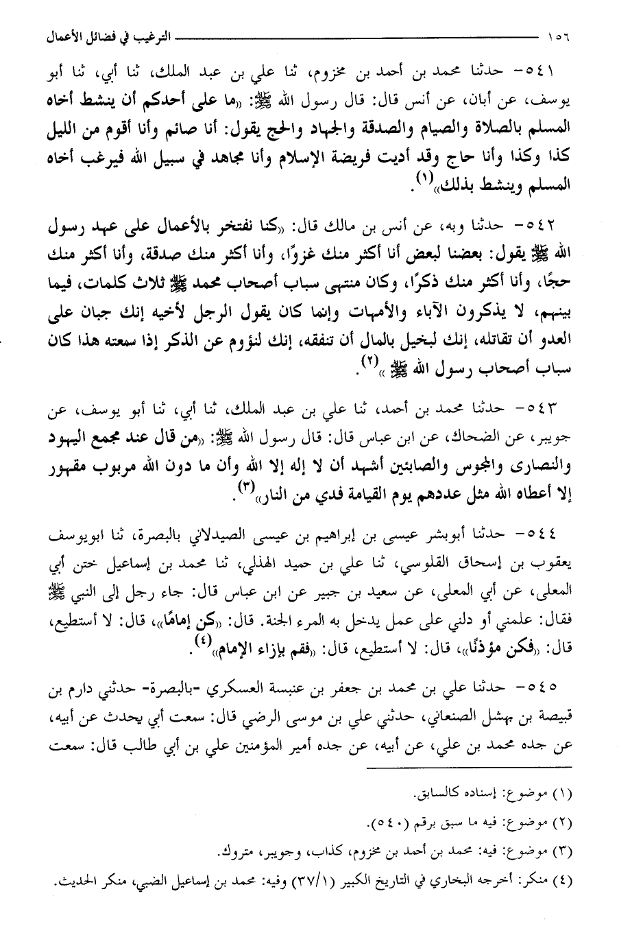 541 - حَدَّثَنَا مُحَمَّدُ بْنُ أَحْمَدَ بْنِ مَخْزُومٍ، ثنا عَلِيُّ بْنُ عَبْدِ الْمَلِكِ، ثنا أَبِي، ثنا أَبُو يُوسُفَ، عَنْ أَبَانَ، عَنْ أَنَسٍ، قَالَ: قَالَ رَسُولُ اللَّهِ صَلَّى اللَّهُ عَلَيْهِ وَسَلَّمَ: §" مَا عَلَى أَحَدِكُمْ أَنْ يُنَشِّطَ أَخَاهُ الْمُسْلِمَ بِالصَّلَاةِ وَالصِّيَامِ وَالصَّدَقَةِ وَالْجِهَادِ وَالْحَجِّ يَقُولُ: أَنَا صَّائِمُ وَأَنَا أَقُومُ مِنَ اللَّيْلِ كَذَا وَكَذَا وَأَنَا حَاجٌّ وَقَدْ أَدَّيْتُ فَرِيضَةَ الْإِسْلَامِ وَأَنَا مُجَاهِدٌ فِي سَبِيلِ اللَّهِ فَيُرَغِبُ أَخَاهُ الْمُسْلِمَ وَيُنَشِّطُ بِذَلِكَ "