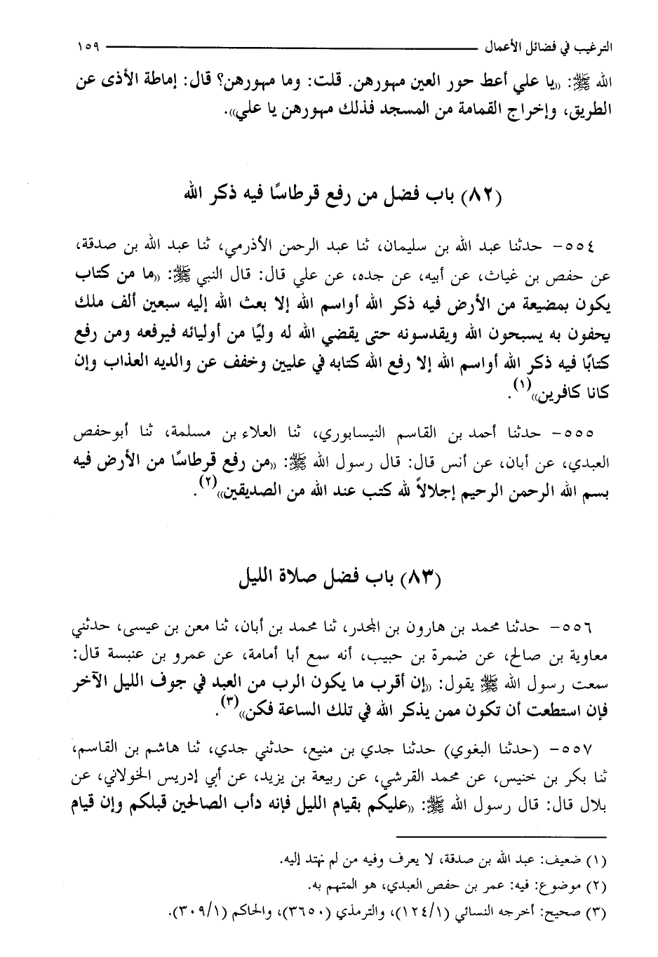 554 - حَدَّثَنَا عَبْدُ اللَّهِ بْنُ سُلَيْمَانَ، ثنا عَبْدُ الرَّحْمَنِ الْأَذْرَمِيُّ، ثنا عَبْدُ اللَّهِ بْنُ صَدَقَةَ، عَنْ حَفْصِ بْنِ غِيَاثٍ، عَنْ أَبِيهِ، عَنْ جَدِّهِ، عَنْ عَلِيٍّ، قَالَ: قَالَ النَّبِيُّ صَلَّى اللَّهُ عَلَيْهِ وَسَلَّمَ: §«مَا مِنْ كِتَابٍ يَكُونُ بِمَضْيَعَةٍ مِنَ الْأَرْضِ فِيهِ ذِكْرُ اللَّهِ أَوِ اسْمُ اللَّهِ إِلَّا بَعَثَ اللَّهُ إِلَيْهِ سَبْعِينَ أَلْفَ مَلَكٍ يَحُفُّونَ بِهِ يُسَبِّحُونَ اللَّهَ وَيُقَدِّسُونَهُ حَتَّى يُقَيِّضَ اللَّهُ لَهُ وَلِيًّا مِنْ أَوْلِيَائِهِ فَيَرْفَعَهُ، وَمَنْ رَفَعَ كِتَابًا فِيهِ ذِكْرُ اللَّهِ أَوِ اسْمُ اللَّهِ رَفَعَ اللَّهُ كِتَابَهُ فِي عِلِّيِّينَ وَخَفَّفَ عَنْ وَالِدَيْهِ الْعَذَابَ وَإِنْ كَانَا كَافِرَيْنِ»