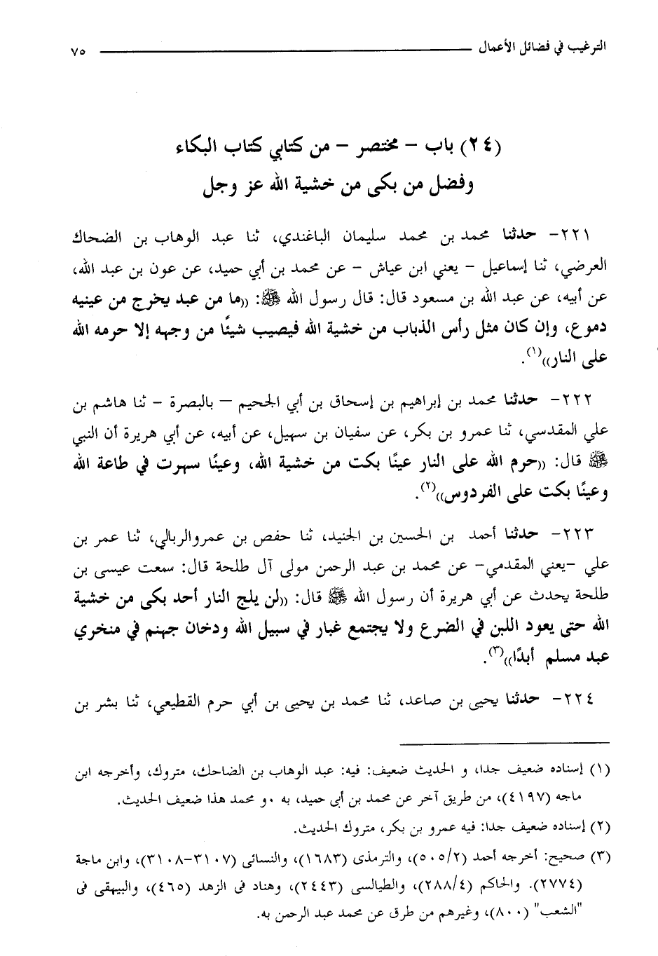 224 - حَدَّثَنَا أَحْمَدُ بْنُ الْحُسَيْنِ بْنِ الْجُنَيْدِ، ثنا حَفْصُ بْنُ عَمْرٍو الرَّبَالِيُّ، ثنا عُمَرُ بْنُ عَلِيٍّ يَعْنِي الْمُقَدَّمِيَّ، عَنْ مُحَمَّدِ بْنِ عَبْدِ الرَّحْمَنِ، مَوْلَى آلِ طَلْحَةَ، قَالَ: سَمِعْتُ عِيسَى بْنَ طَلْحَةَ، يُحَدِّثُ عَنْ أَبِي هُرَيْرَةَ، أَنَّ رَسُولَ اللَّهِ صَلَّى اللَّهُ عَلَيْهِ وَسَلَّمَ قَالَ: §«لَنْ يَلِجَ النَّارَ أَحَدٌ بَكَى مِنْ خَشْيَةِ اللَّهِ حَتَّى يَعُودَ اللَّبَنُ فِي الضَّرْعِ، وَلَا يَجْتَمِعُ غُبَارٌ فِي سَبِيلِ اللَّهِ وَدُخَانُ جَهَنَّمَ فِي مَنْخَرَيْ عَبْدٍ مُسْلِمٍ أَبَدًا»
