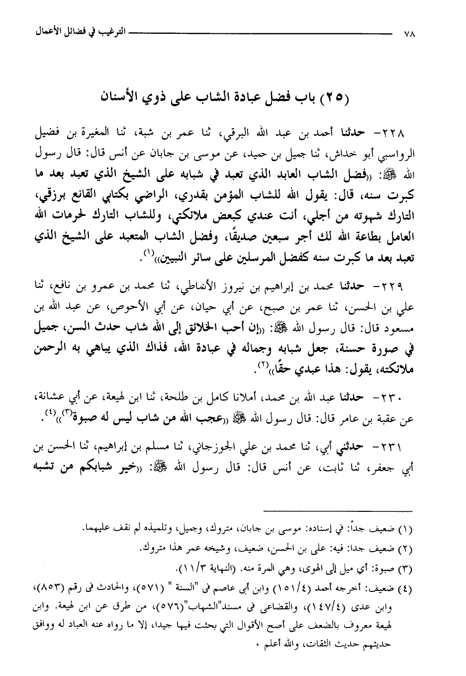 229 - حَدَّثَنَا أَحْمَدُ بْنُ عَبْدِ اللَّهِ الْبَرْقِيُّ، ثنا عُمَرُ بْنُ شَبَّةَ، ثنا الْمُغِيرَةُ بْنُ فُضَيْلٍ الرَّوَاسِبِيُّ أَبُو خِدَاشٍ، ثنا جَمِيلُ بْنُ حُمَيْدٍ، عَنْ مُوسَى بْنِ جَابَانَ، عَنْ أَنَسٍ، قَالَ: قَالَ رَسُولُ اللَّهِ صَلَّى اللَّهُ عَلَيْهِ وَسَلَّمَ: §" فَضْلُ الشَّابِّ الْعَابِدِ الَّذِي تَعَبَّدَ فِي شَبَابِهِ عَلَى الشَّيْخِ الَّذِي تَعَبَّدَ بَعْدَمَا كَبِرَتْ سِنُّهُ، قَالَ: يَقُولُ اللَّهُ: لِلشَّابِّ الْمُؤْمِنِ بِقَدَرِي، الرَّاضِي بِكِتَابِي الْقَانِعِ بِرِزْقِي، التَّارِكِ شَهْوَتَهُ مِنْ أَجْلِي، أَنْتَ عِنْدِي كَبَعْضِ مَلَائِكَتِي، وَلِلشَّابِّ التَّارِكِ لِحُرُمَاتِ اللَّهِ الْعَامِلِ بِطَاعَةِ اللَّهِ كُلُّ أَجْرِ سَبْعِينَ صِدِّيقًا، وَفَضْلُ الشَّابِّ الْمُتَعَبِّدِ عَلَى الشَّيْخِ الَّذِي تَعَبَّدَ بَعْدَمَا كَبِرَتْ سِنُّهُ كَفَضْلِ الْمُرْسَلِينَ عَلَى سَائِرِ النَّبِيِّينَ "