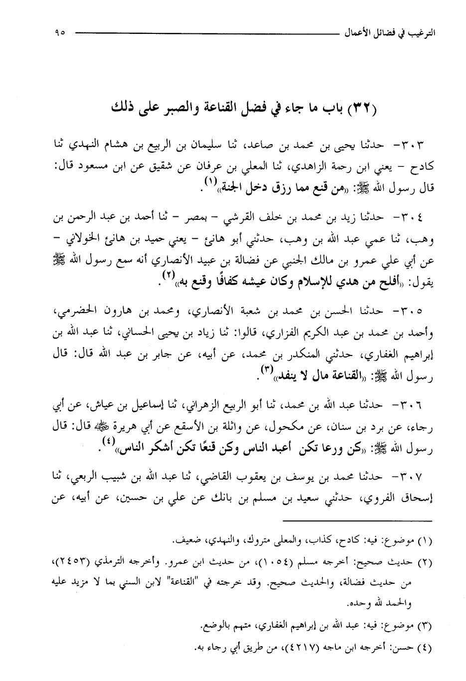 304 - حَدَّثَنَا يَحْيَى بْنُ مُحَمَّدِ بْنِ صَاعِدٍ، ثنا سُلَيْمَانُ بْنُ الرَّبِيعِ بْنِ هِشَامٍ النَّهْدِيُّ، ثنا كَادِحٌ يَعْنِي ابْنَ رَحْمَةَ الزَّاهِدِيَّ، ثنا الْمُعَلَّى بْنُ عِرْفَانَ، عَنْ شَقِيقٍ، عَنِ ابْنِ مَسْعُودٍ، قَالَ: قَالَ رَسُولُ اللَّهِ صَلَّى اللَّهُ عَلَيْهِ وَسَلَّمَ: §«مَنْ قَنَعَ بِمَا رُزِقَ دَخَلَ الْجَنَّةَ»