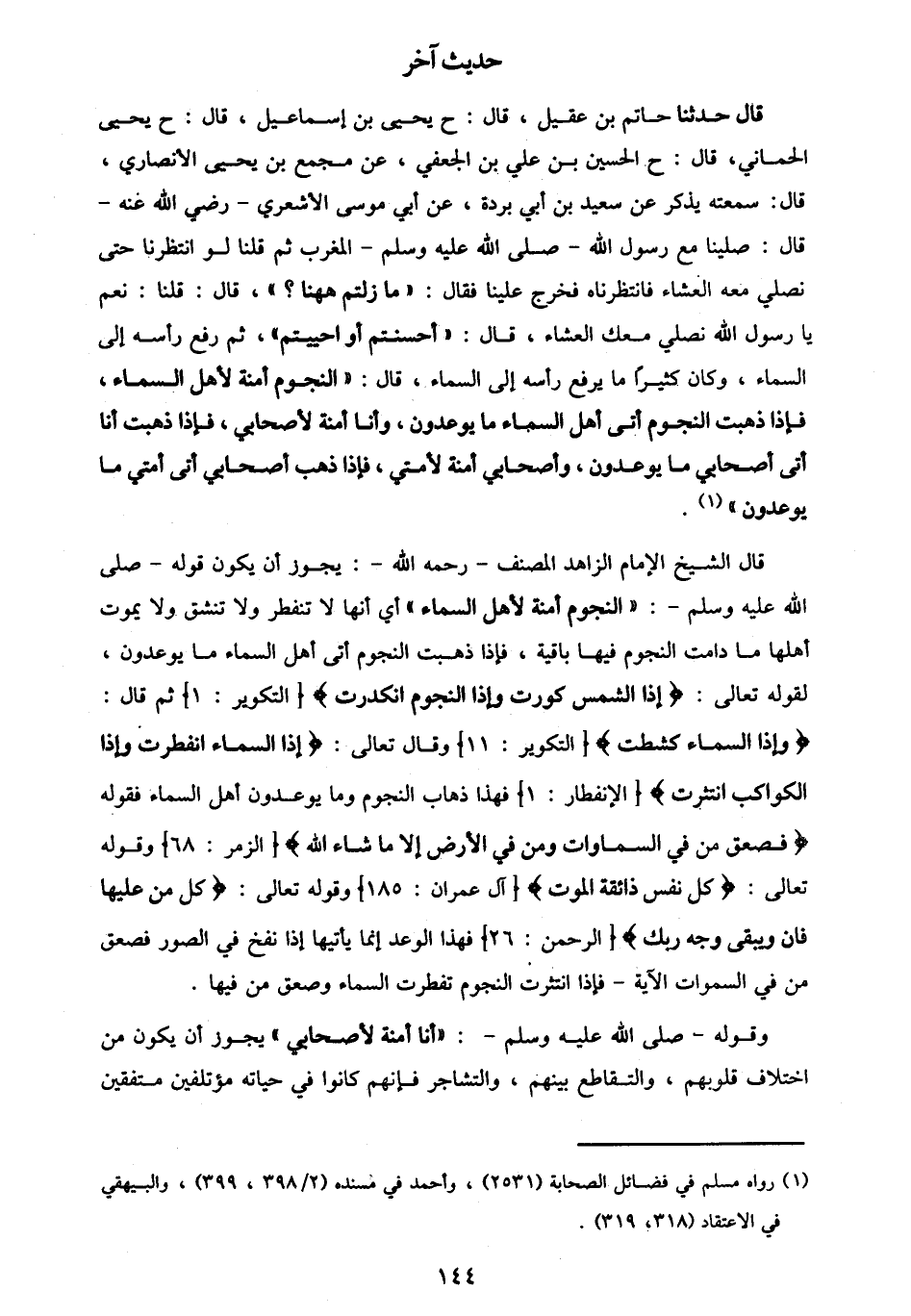 قَالَ: حَدَّثَنَا حَاتِمُ بْنُ عَقِيلٍ، قَالَ: ح يَحْيَى بْنُ إِسْمَاعِيلَ قَالَ: ح يَحْيَى الْحِمَّانِيُّ قَالَ: ح الْحُسَيْنُ بْنُ عَلِيِّ بْنِ الْجُعْفِيِّ، عَنْ مُجَمِّعِ بْنِ يَحْيَى الْأَنْصَارِيِّ قَالَ: سَمِعْتُهُ يَذْكُرُ عَنْ سَعِيدِ بْنِ أَبِي بُرْدَةَ، عَنْ أَبِي مُوسَى الْأَشْعَرِيِّ رَضِيَ اللَّهُ عَنْهُ قَالَ: صَلَّيْنَا مَعَ رَسُولِ اللَّهِ صَلَّى اللهُ عَلَيْهِ وَسَلَّمَ الْمَغْرِبَ، ثُمَّ قُلْنَا: لَوِ انْتَظَرْنَا، حَتَّى نُصَلِّيَ مَعَهُ الْعِشَاءَ، فَانْتَظَرْنَاهُ، فَخَرَجَ عَلَيْنَا فَقَالَ: «مَا زِلْتُمْ هَاهُنَا؟» قَالَ: قُلْنَا: نَعَمْ يَا رَسُولَ اللَّهِ، نُصَلِّي مَعَكَ الْعِشَاءَ قَالَ: «أَحْسَنْتُمْ أَوْ أَحَيَيْتُمْ» ، ثُمَّ رَفَعَ رَأْسَهُ إِلَى السَّمَاءِ، وَكَانَ كَثِيرًا مَا يَرْفَعُ رَأْسَهُ إِلَى السَّمَاءِ قَالَ: «§النُّجُومُ أَمَنَةٌ لِأَهْلِ السَّمَاءِ، فَإِذَا ذَهَبْتِ النُّجُومُ أَتَى أَهْلَ السَّمَاءِ مَا يُوعَدُونَ، وَأَنَا أَمَنَةٌ لِأَصْحَابِي، فَإِذَا ذَهَبْتُ أَنَا أَتَى أَصْحَابِي مَا يُوعَدُونَ، وَأَصْحَابِي أَمَنَةٌ لِأُمَّتِي، فَإِذَا ذَهَبَ أَصْحَابِي أَتَى أُمَّتِي مَا يُوعَدُونَ» قَالَ الشَّيْخُ الْإِمَامُ الزَّاهِدُ الْمُصَنِّفُ رَحِمَهُ اللَّهُ: يَجُوزُ أَنْ يَكُونَ قَوْلُهُ صَلَّى اللهُ عَلَيْهِ وَسَلَّمَ: «النُّجُومُ أَمَنَةٌ لِأَهْلِ السَّمَاءِ» أَيْ أَنَّهَا لَا تَنْفَطِرُ، وَلَا تَنْشَقُّ، وَلَا يَمُوتُ أَهْلُهَا مَا دَامَتِ النُّجُومُ فِيهَا بَاقِيَةً، فَإِذَا ذَهَبْتِ النُّجُومُ أَتَى أَهْلَ السَّمَاءِ مَا يُوعَدُونَ لِقَوْلِهِ تَعَالَى {إِذَا الشَّمْسُ كُوِّرَتْ وَإِذَا النُّجُومُ انْكَدَرَتْ} [التكوير: 2] ، ثُمَّ قَالَ {وَإِذَا السَّمَاءُ كُشِطَتْ} [التكوير: 11] ، وَقَالَ تَعَالَى {إِذَا السَّمَاءُ انْفَطَرَتْ وَإِذَا الْكَوَاكِبُ انْتَثَرَتْ} [الانفطار: 1] ، فَهَذَا ذَهَابُ النُّجُومِ، وَمَا يُوعَدُونَ أَهْلُ السَّمَاءِ فَقَوْلُهُ {فَصَعِقَ مَنْ فِي السَّماَوَاتِ وَمَنْ فِي الْأَرْضِ إِلَّا مَا شَاءَ اللَّهُ} ، وَقَوْلُهُ تَعَالَى {كُلُّ نَفْسٍ ذَائِقَةُ الْمَوْتِ} [آل عمران: 185] ، وَقَوْلُهُ تَعَالَى {كُلُّ مَنْ عَلَيْهَا فَانٍ وَيَبْقَى وَجْهُ رَبِّكَ} [الرحمن: 26] ، فَهَذَا الْوَعْدُ إِنَّمَا يَأْتِيهَا إِذَا نُفِخَ فِي الصُّورِ فَصَعِقَ مَنْ فِي السَّمَوَاتِ، الْآيَةَ. فَإِذَا انْتَثَرَتِ النُّجُومُ تَفَطَّرَتِ السَّمَاءُ، وَصَعِقَ مَنْ فِيهَا. وَقَوْلُهُ صَلَّى اللهُ عَلَيْهِ وَسَلَّمَ: «أَنَا أَمَنَةٌ لِأَصْحَابِي» يَجُوزُ أَنْ يَكُونَ مِنِ اخْتِلَافِ قُلُوبِهِمْ، وَالتَّقَاطُعِ بَيْنَهُمْ وَالتَّشَاجُرِ، فَإِنَّهُمْ كَانُوا فِي حَيَاتِهِ مُؤْتَلِفِينَ مُتَّفِقِينَ -[145]- مُتَوَاصِلِينَ مُتَبَادِلِينَ، قُلُوبُهُمْ عَلَى قَلْبٍ وَاحِدٍ، لَيْسَ فِيهَا هِمَّةُ دُنْيَا، وَلَا عِزَّةُ نَفْسٍ، وَلَا نَظَرٌ إِلَى شَيْءٍ فَاسْتَوَى لِلَّهِ تَعَالَى، فَلَمَّا تُوُفِّيَ رَسُولُ اللَّهِ صَلَّى اللهُ عَلَيْهِ وَسَلَّمَ تَغَيَّرَتْ قُلُوبُهُمْ