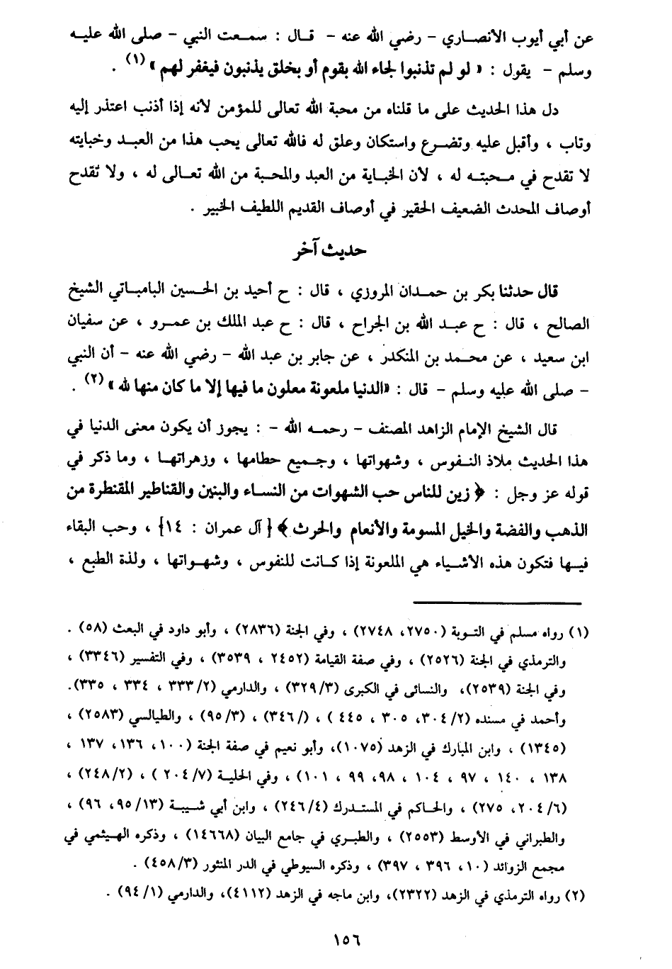 قَالَ: حَدَّثَنَا بَكْرُ بْنُ حَمْدَانَ الْمَرْوَزِيُّ، قَالَ: ح أَحْيَدُ بْنُ الْحُسَيْنِ الْبَامْبَاتِيُّ الشَّيْخُ الصَّالِحُ قَالَ: ح عَبْدُ اللَّهِ بْنُ الْجَرَّاحِ قَالَ: ح عَبْدُ الْمَلِكِ بْنُ عَمْرٍو، عَنْ سُفْيَانَ بْنِ سَعِيدٍ، عَنْ مُحَمَّدِ بْنِ الْمُنْكَدِرِ، عَنْ جَابِرِ بْنِ عَبْدِ اللَّهِ رَضِيَ اللَّهُ عَنْهُ أَنَّ النَّبِيَّ صَلَّى اللهُ عَلَيْهِ وَسَلَّمَ قَالَ: §«الدُّنْيَا مَلْعُونَةٌ مَلْعُونٌ مَا فِيهَا إِلَّا مَا كَانَ مِنْهَا لِلَّهِ» قَالَ الشَّيْخُ الْإِمَامُ الزَّاهِدُ الْمُصَنِّفُ رَحِمَهُ اللَّهُ: يَجُوزُ أَنْ يَكُونَ مَعْنَى الدُّنْيَا فِي هَذَا الْحَدِيثِ مَلَاذَّ النُّفُوسِ، وَشَهَوَاتِهَا، وَجَمِيعَ حُطَامِهَا، وَزَهْرَاتِهَا، وَمَا ذُكِرَ فِي قَوْلِهِ عَزَّ وَجَلَّ {زُيِّنَ لِلنَّاسِ حُبُّ الشَّهَوَاتِ مِنَ النِّسَاءِ وَالْبَنِينَ وَالْقَنَاطِيرِ الْمُقَنْطَرَةِ مِنَ الذَّهَبِ وَالْفِضَّةِ وَالْخَيْلِ الْمُسَوَّمَةِ وَالْأَنْعَامِ وَالْحَرْثِ} [آل عمران: 14] ، وَحُبَّ الْبَقَاءِ فِيهَا، فَتَكُونُ هَذِهِ الْأَشْيَاءُ هِيَ الْمَلْعُونَةَ إِذَا كَانَتْ لِلنُّفُوسِ وَشَهَوَاتِهَا وَلَذَّةِ الطَّبْعِ -[157]-، وَالتَّلَهِّي بِهَا، وَالشُّغْلِ فِيهَا، وَالْحُبِّ لَهَا، وَلَمْ تَكُنْ لِلَّهِ تَعَالَى وَلَا فِيهِ؛ لِأَنَّ الدُّنْيَا فِي الْحَقِيقَةِ هِيَ الْحَيَاةُ الْأُولَى الَّتِي يَلِيهَا الْمَوْتُ وَالْفَنَاءُ، وَالْآخِرَةُ هِيَ الْحَيَاةُ الْبَاقِيَةُ، الَّتِي لَيْسَ لَهَا زَوَالٌ وَلَا فَنَاءٌ وَيَجُوزُ أَنْ يَكُونَ مَعْنَى قَوْلِهِ: «الدُّنْيَا مَلْعُونَةٌ» أَيْ: مَرْفُوضَةٌ مَتْرُوكَةٌ، وَمَا فِيهَا أَيْ: مَا فِي الْحَيَاةِ الْأُولَى مِنْ هَذِهِ الشَّهَوَاتِ، وَالْمَلَاذِّ، وَالْحُطَامِ، وَمَا ذُكِرَ فِي الْآيَةِ مَلْعُونٌ، أَيْ: مَتْرُوكٌ يَجِبُ تَرْكُهَا، وَرَفْضُهَا، وَالْإِعْرَاضُ عَنْهَا، فَإِنَّ اللَّهَ عَزَّ وَجَلَّ عَلَى هَذَا حَثَّ، وَإِلَيْهِ نَدَبَ، وَفِيهِ رَغَّبَ، وَعَنْهَا زَهَّدَ، فَقَالَ اللَّهُ عَزَّ وَجَلَّ {إِنَّمَا مَثَلُ الْحَيَاةِ الدُّنْيَا كَمَاءٍ أَنْزَلْنَاهُ مِنَ السَّمَاءِ} [يونس: 24] ، وَقَالَ {إِنَّمَا الْحَيَاةُ الدُّنْيَا لَعِبٌ وَلَهْوٌ} [محمد: 36] ، وَقَالَ اللَّهُ تَعَالَى {فَلَا تَغُرَّنَّكُمُ الْحَيَاةُ الدُّنْيَا} [لقمان: 33] ، وَقَالَ تَعَالَى {لِيَبْلُوَكُمْ أَيُّكُمْ أَحْسَنُ عَمَلًا} [هود: 7] رُوِيَ عَنِ ابْنِ عَبَّاسٍ رَضِيَ اللَّهُ عَنْهُمَا: أَيُّكُمْ أَحْسَنُ لِلدُّنْيَا تَرْكًا، وَعَنْهَا إِعْرَاضًا، وَاللَّعْنُ عِنْدَ الْعَرَبِ التَّرْكُ، وَالْمَلْعُونُ الْمَتْرُوكُ، كَذَا قَالَ بَعْضُ أَهْلِ اللُّغَةِ، وَأَنْشَدَ يَصِفُ الْمَغَارَةَ: