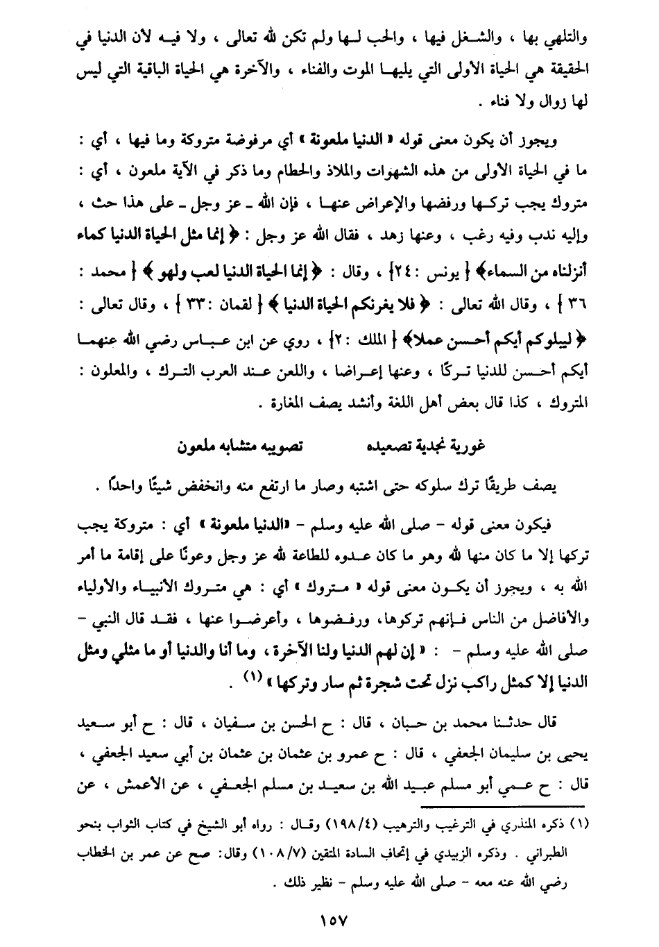 فَقَدْ قَالَ النَّبِيُّ صَلَّى اللهُ عَلَيْهِ وَسَلَّمَ: «إِنَّ §لَهُمُ الدُّنْيَا وَلَنَا الْآخِرَةَ، وَمَا أَنَا وَالدُّنْيَا أَوْ مَا مَثَلِي وَمَثَلُ الدُّنْيَا إِلَّا كَمَثَلِ رَاكِبٍ نَزَلَ تَحْتَ شَجَرَةٍ، ثُمَّ سَارَ وَتَرَكَهَا» قَالَ: حَدَّثَنَا مُحَمَّدُ بْنُ حَبَّانَ، قَالَ: ح الْحَسَنُ بْنُ سُفْيَانَ قَالَ: ح أَبُو سَعِيدٍ يَحْيَى بْنُ سُلَيْمَانَ الْجُعْفِيُّ قَالَ: ح عَمْرُو بْنُ عُثْمَانَ بْنِ عُثْمَانَ بْنِ أَبِي سَعِيدٍ الْجُعْفِيُّ قَالَ: ح عَمِّي أَبُو مُسْلِمٍ عُبَيْدُ اللَّهِ بْنُ سَعِيدِ بْنِ مُسْلِمٍ الْجُعْفِيُّ، عَنِ الْأَعْمَشِ، عَنْ -[158]- حَبِيبِ بْنِ أَبِي ثَابِتٍ، عَنْ أَبِي عَبْدِ الرَّحْمَنِ السُّلَمِيِّ، عَنْ عَبْدِ اللَّهِ بْنِ مَسْعُودٍ، رَضِيَ اللَّهُ عَنْهُ عَنِ النَّبِيِّ صَلَّى اللهُ عَلَيْهِ وَسَلَّمَ بِذَلِكَ