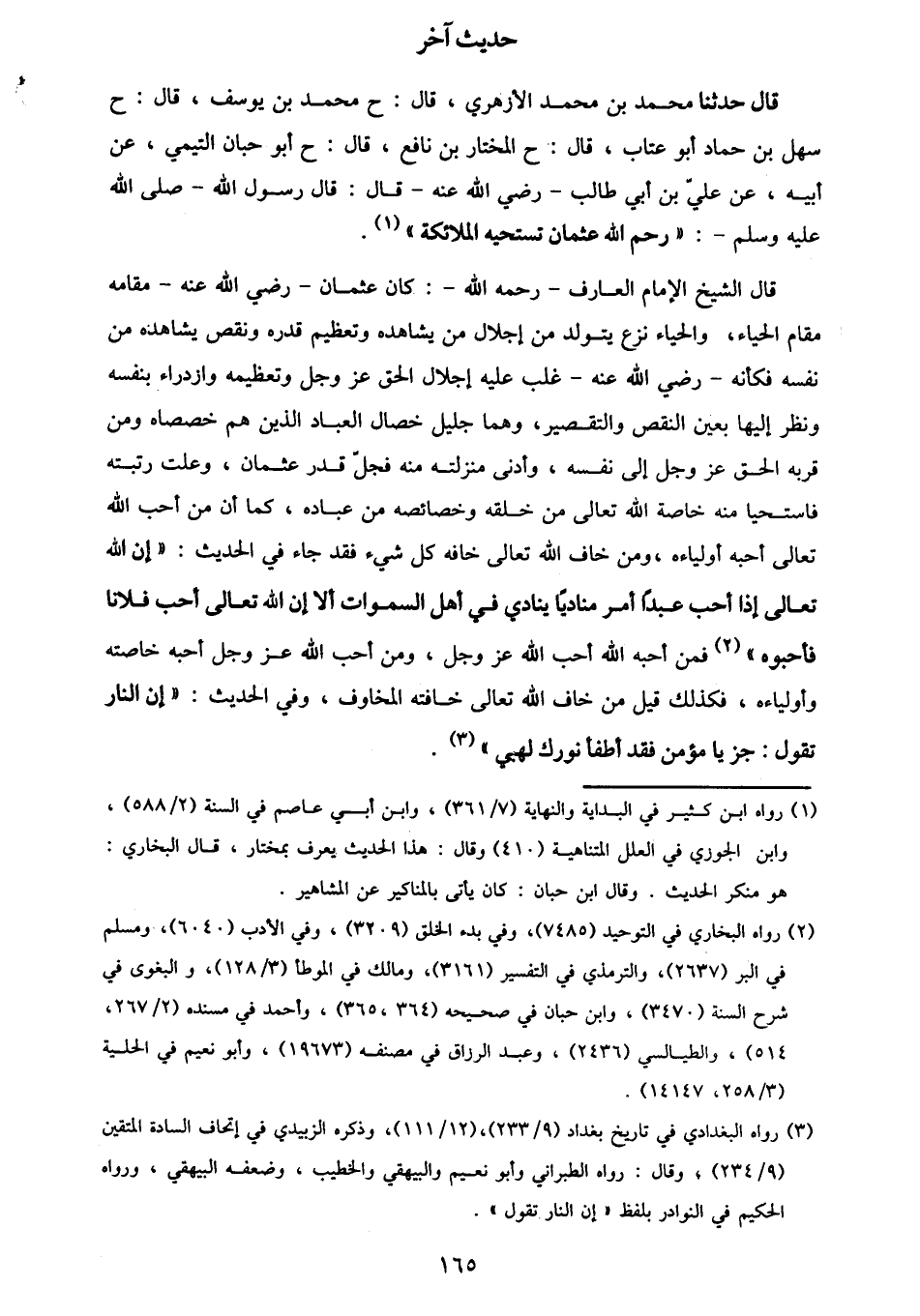 قَالَ: حَدَّثَنَا مُحَمَّدُ بْنُ مُحَمَّدٍ الْأَزْهَرِيُّ، قَالَ: ح مُحَمَّدُ بْنُ يُوسُفَ قَالَ: ح سَهْلُ بْنُ حَمَّادٍ أَبُو عَتَّابٍ قَالَ: ح الْمُخْتَارُ بْنُ نَافِعٍ قَالَ: ح أَبُو حَبَّانَ التَّيْمِيُّ، عَنْ أَبِيهِ، عَنْ عَلِيِّ بْنِ أَبِي طَالِبٍ، رَضِيَ اللَّهُ عَنْهُ قَالَ: قَالَ رَسُولُ اللَّهِ صَلَّى اللهُ عَلَيْهِ وَسَلَّمَ: §«رَحِمَ اللَّهُ عُثْمَانَ تَسْتَحِيهِ الْمَلَائِكَةُ» قَالَ الشَّيْخُ الْإِمَامُ الْعَارِفُ رَحِمَهُ اللَّهُ: كَانَ عُثْمَانُ رَضِيَ اللَّهُ عَنْهُ مَقَامُهُ مَقَامُ الْحَيَاءِ، وَالْحَيَاءُ نَزْعٌ يَتَوَلَّدُ مِنْ إِجْلَالِ مَنْ يُشَاهِدُهِ، وَتَعْظِيمِ قَدْرِهِ، وَنَقْصٍ يُشَاهِدُهُ مِنْ نَفْسِهِ، فَكَأَنَّهُ رَضِيَ اللَّهُ عَنْهُ غَلَبَ عَلَيْهِ إِجْلَالُ الْحَقِّ عَزَّ وَجَلَّ، وَتَعْظِيمُهُ، وَازْدِرَاءٌ بِنَفْسِهِ، وَنَظَرَ إِلَيْهَا بِعَيْنِ النَّقْصِ، وَالتَّقْصِيرِ، وَهُمَا جَلِيلُ خِصَالِ الْعِبَادِ الَّذِينَ هُمْ خُصَصَاهُ، وَمَنْ قَرَّبَهُ الْحَقُّ عَزَّ وَجَلَّ إِلَى نَفْسِهِ، وَأَدْنَى مَنْزِلَتَهُ مِنْهُ، فَجَلَّ قَدْرُ عُثْمَانَ، وَعَلَتْ رُتْبَتُهُ، فَاسْتَحْيَا مِنْهُ خَاصَّةُ اللَّهِ تَعَالَى مِنْ خَلْقِهِ، وَخَصَائِصُهُ مِنْ عِبَادِهِ، كَمَا أَنَّ مَنَ أَحَبَّ اللَّهَ تَعَالَى أَحَبَّهُ أَوْلِيَاؤُهُ، وَمَنْ خَافَ اللَّهَ تَعَالَى خَافَهُ كُلُّ شَيْءٍ، فَقَدْ جَاءَ فِي الْحَدِيثِ: " إِنَّ اللَّهَ تَعَالَى إِذَا أَحَبَّ عَبْدًا أَمَرَ مُنَادِيًا يُنَادِي فِي أَهْلِ السَّمَوَاتِ: أَلَا إِنَّ اللَّهَ تَعَالَى أَحَبَّ فُلَانًا، فَأَحِبُّوهُ "، فَمَنْ أَحَبَّهُ اللَّهُ، أَحَبَّ اللَّهَ عَزَّ وَجَلَّ، وَمَنْ أَحَبَّ اللَّهَ عَزَّ وَجَلَّ، أَحَبَّهُ خَاصَّتُهُ، وَأَوْلِيَاؤُهُ، فَكَذَلِكَ قِيلَ: مَنْ خَافَ اللَّهَ تَعَالَى خَافَتْهُ الْمَخَاوِفُ، وَفِي الْحَدِيثِ: " إِنَّ النَّارَ تَقُولُ: جُزْ يَا مُؤْمِنُ، فَقَدْ أَطْفَأَ نُورُكَ لَهَبِي " -[166]- فَكَذَلِكَ مَنِ اسْتَحْيَا مِنَ اللَّهِ عَزَّ وَجَلَّ اسْتَحْيَا مِنْهُ خَاصَّةُ اللَّهِ عَزَّ وَجَلَّ، وَخَالِصَتُهُ مِنْ خَلْقِهِ، أَلَا يَرَى أَنَّ النَّبِيَّ صَلَّى اللهُ عَلَيْهِ وَسَلَّمَ لَمَّا دَخَلَ عَلَيْهِ عُثْمَانُ رَضِيَ اللَّهُ عَنْهُ، وَفَخِذُهُ مَكْشُوفَةٌ، غَطَّاهَا حَيَاءً مِنْ عُثْمَانَ، وَقَالَ: «أَلَا اسْتَحِي مِمَّنْ تَسْتَحِي مِنْهُ الْمَلَائِكَةُ» . وَالْحَيَاءُ حَيَاءَانِ: حَيَاءٌ مِنَ اللَّهِ تَعَالَى، وَحَيَاءٌ مِنَ النَّاسِ، فَالْحَيَاءُ مِنَ اللَّهِ تَعَالَى مَا قَالَهُ النَّبِيُّ صَلَّى اللهُ عَلَيْهِ وَسَلَّمَ، وَوَصَفَهُ فِيمَا
