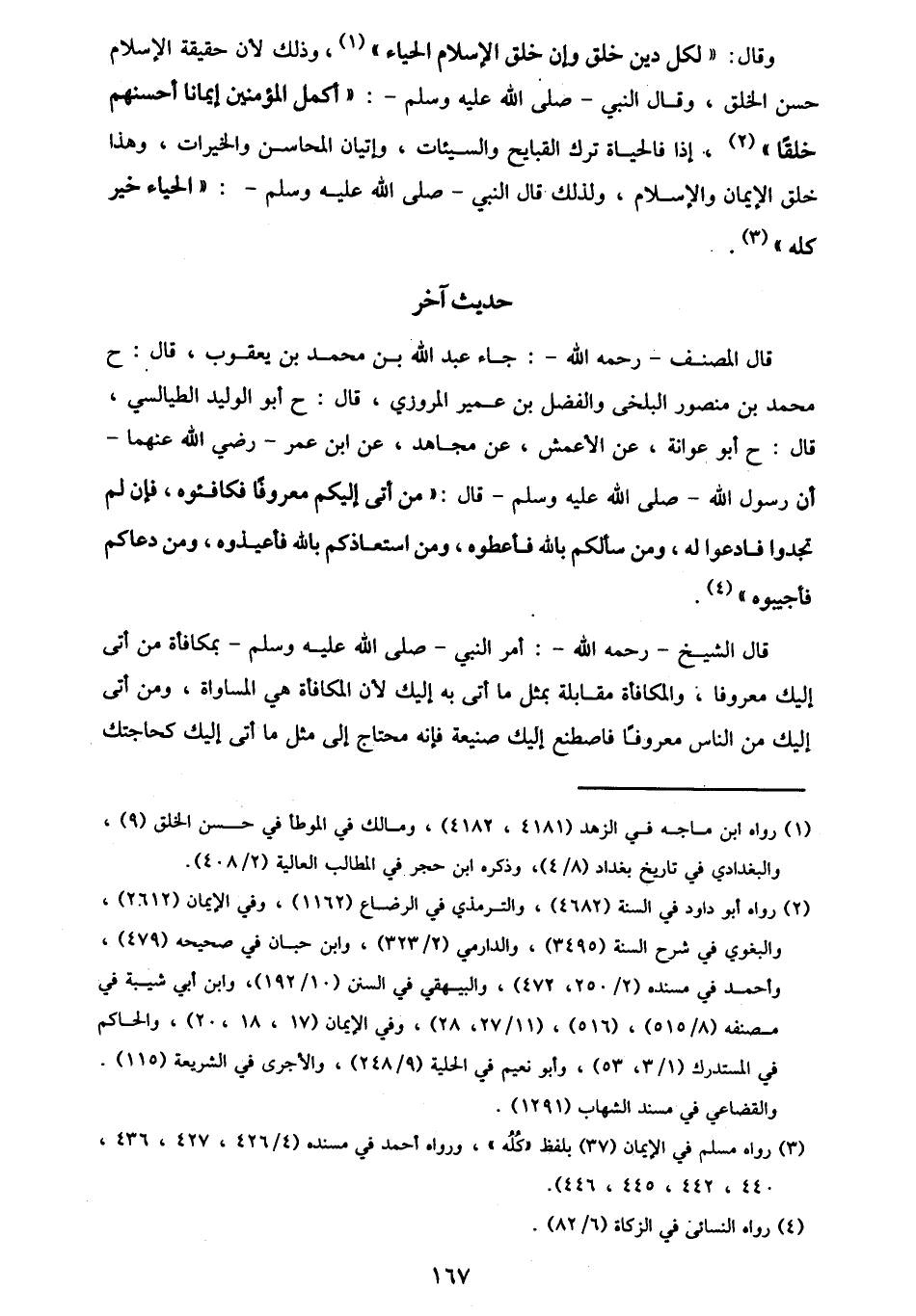 قَالَ الْمُصَنِّفُ رَحِمَهُ اللَّهُ: جَاءَ عَبْدُ اللَّهِ بْنُ مُحَمَّدِ بْنِ يَعْقُوبَ قَالَ: ح مُحَمَّدُ بْنُ مَنْصُورٍ الْبَلْخِيُّ، وَالْفَضْلُ بْنُ عُمَيْرٍ الْمَرْوَزِيُّ قَالَ: ح أَبُو الْوَلِيدِ الطَّيَالِسِيُّ قَالَ: ح أَبُو عَوَانَةَ، عَنِ الْأَعْمَشِ، عَنْ مُجَاهِدٍ، عَنِ ابْنِ عُمَرَ، رَضِيَ اللَّهُ عَنْهُمَا، أَنَّ رَسُولَ اللَّهِ صَلَّى اللهُ عَلَيْهِ وَسَلَّمَ قَالَ: «§مَنْ آَتَى إِلَيْكُمْ مَعْرُوفًا فَكَافِئُوهُ، فَإِنْ لَمْ تَجِدُوا فَادْعُوا لَهُ، وَمَنْ سَأَلَكُمْ بِاللَّهِ فَأَعْطُوهُ، وَمَنِ اسْتَعَاذَكُمْ بِاللَّهِ فَأَعِيذُوهُ، وَمَنْ دَعَاكُمْ فَأَجِيبُوهُ» قَالَ الشَّيْخُ رَحِمَهُ اللَّهُ: أَمَرَ النَّبِيُّ صَلَّى اللهُ عَلَيْهِ وَسَلَّمَ بِمُكَافَأَةِ مَنْ آَتَى إِلَيْكَ مَعْرُوفًا، وَالْمُكَافَأَةُ مُقَابَلَةٌ بِمِثْلِ مَا أُتِيَ بِهِ إِلَيْكَ؛ لِأَنَّ الْمُكَافَأَةَ هِيَ الْمُسَاوَاةُ، وَمَنْ آَتَى إِلَيْكَ مِنَ النَّاسِ مَعْرُوفًا فَاصْطَنِعْ إِلَيْهِ صَنِيعَةً؛ فَإِنَّهُ مُحْتَاجٌ إِلَى مِثْلِ مَا آَتَى إِلَيْكَ كَحَاجَتِكَ -[168]- إِلَى مَا اصْطَنَعَ عِنْدَكَ؛ لِأَنَّ اصْطِنَاعَهُ إِلَيْكَ فِي نَفْعٍ يَجُرُّهُ إِلَيْكَ، أَوْ ضُرٍّ يَدْفَعُهُ عَنْكَ، أَوْ خَلَّةٍ يَسُدُّهَا لَكَ، وَهُوَ ذُو خَلَّةٍ مِثْلُكَ، وَمُحْتَاجٌ إِلَى دَفْعٍ وَنَفْعٍ كَانَتْ، فَإِنْ قَابَلْتَهُ بِمِثْلِهِ آَتَيْتَ إِلَيْهِ بِمِثْلِ مَا آَتَى إِلَيْكَ، فَقَدْ سَاوَيْتَهُ، وَالنِّعْمَةُ لِلَّهِ عَلَيْكَ فِي الْإِذْنِ لَهُ بِاصْطِنَاعِ الْمَعْرُوفِ إِلَيْكَ، فَالْمُنْعِمُ عَلَيْكَ بِهَا هُوَ اللَّهُ سُبْحَانَهُ، وَالشُّكْرُ للَّهِ عَلَيْكَ فَرْضٌ وَاجِبٌ، وَالشُّكْرُ رُؤْيَةُ النِّعْمَةِ مِنَ الْمُنْعِمِ، وَالْتِزَامُ الْعُبُودِيَّةِ لِلَّهِ تَعَالَى بِالطَّاعَةِ، فِيمَا أَمَرَ وَنَهَى، وَالْحَمْدُ لَهُ بِالثَّنَاءِ عَلَيْهِ، وَالِاعْتِرَافُ بِرُؤْيَةِ التَّقْصِيرِ فِي شُكْرِهِ، لِأَنَّ شُكْرَكَ لِلَّهِ نِعْمَةٌ مِنَ اللَّهِ عَلَيْكَ، يَجِبُ عَلَيْكَ شُكْرَهَا، وَهَذِهِ لَيْسَتْ لَهَا غَايَةٌ، وَلَا حَدٌّ، فَالِاعْتِرَافُ بِالتَّقْصِيرِ لَازِمٌ فِيهِ، فَحَقُّ اللَّهِ فِيهِ الشُّكْرُ لَهُ عَلَى هَذِهِ الشَّرِيطَةِ، وَمِنَ الْمُصْطَنِعِ مُكَافَأَتُهُ بِمِثْلِهِ، فَإِنْ عَجَزْتَ عَنْ مُكَافَأَتِهِ، فَالْإِحَالَةُ عَلَى اللَّهِ، وَهُوَ الدُّعَاءُ لَهُ، فَكَأَنَّكَ تَقُولُ: أَنَا عَاجِزٌ عَنْ مُكَافَأَتِهِ، وَأَنْتَ عَلَيْهِ قَادِرٌ، فَكَافِئْهُ عَنِّي، وَجَازِهِ بِهِ وَهُوَ مَعْنَى قَوْلِ النَّبِيِّ صَلَّى اللهُ عَلَيْهِ وَسَلَّمَ، " إِذَا قَالَ لِأَخِيهِ: جَزَاكَ اللَّهُ خَيْرًا، فَقَدْ بَلَغَ فِي الثَّنَاءِ "