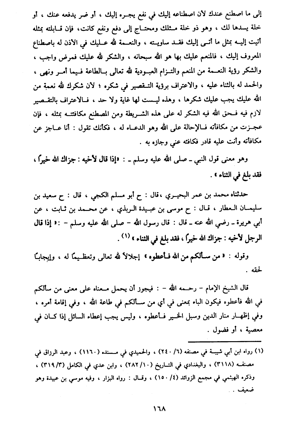 حَدَّثَنَاهُ مُحَمَّدُ بْنُ عُمَرَ الْبُحَيْرِيُّ، قَالَ: ح أَبُو مُسْلِمٍ الْكَجِّيُّ قَالَ: ح سَعِيدُ بْنُ سُلَيْمَانَ الْعَطَّارُ قَالَ: ح مُوسَى بْنُ عُبَيْدَةَ الرَّبَذِيُّ، عَنْ مُحَمَّدِ بْنِ ثَابِتٍ، عَنْ أَبِي هُرَيْرَةَ، رَضِيَ اللَّهُ عَنْهُ قَالَ: قَالَ رَسُولُ اللَّهِ صَلَّى اللهُ عَلَيْهِ وَسَلَّمَ: " §إِذَا قَالَ الرَّجُلُ لِأَخِيهِ: جَزَاكَ اللَّهُ خَيْرًا، فَقَدْ بَلَغَ فِي الثَّنَاءِ " وَقَوْلُهُ: «مَنْ سَأَلَكُمْ مِنَ اللَّهِ فَأَعْطُوهُ» ، إِجْلَالًا لِلَّهِ تَعَالَى، وَتَعْظِيمًا لَهُ، وَإِيجَابًا لِحَقِّهِ. قَالَ الشَّيْخُ الْإِمَامُ رَحِمَهُ اللَّهُ: فَيَجُوزُ أَنْ يُحْمَلَ مَعْنَاهُ عَلَى مَعْنَى: مَنْ سَأَلَكُمْ فِي اللَّهِ فَأَعْطُوهُ، فَيَكُونُ الْبَاءُ بِمَعْنَى فِي، أَيْ مَنْ سَأَلَكُمْ فِي طَاعَةِ اللَّهِ، وَفِي إِقَامَةِ أَمْرِهِ، وَفِي إِظْهَارِ مَنَارِ الدِّينِ، وَسُبُلِ الْخَيْرِ، فَأَعْطُوهُ، وَلَيْسَ يَجِبُ إِعْطَاءُ السَّائِلِ إِذَا كَانَ فِي مَعْصِيَةٍ، أَوْ فُضُولٍ -[169]-. فَمَنْ سَأَلَ بِاللَّهِ فِيمَا لَيْسَ عَلَيْهِ وَلَا عَلَيْكَ فَرِيضَةٌ، فَأَعْطَاكَ إِيَّاهُ لِإِجْلَالِ حَقِّ اللَّهِ، وَتَعْظِيمِهِ، وَلَيْسَ عَلَيْكَ بِفَرْضٍ وَلَا حَتْمٍ مَنْ سَأَلَ فِيمَا وَجَبَ عَلَيْكَ، وَعَلَى السَّائِلِ فَرْضٌ، فَإِعْطَاؤُكَ إِيَّاهُ فَرْضٌ عَلَيْكَ، وَلَازِمٌ لَكَ لَا يَجُوزُ مَنْعُهُ. وَقَوْلُهُ: «وَمَنِ اسْتَعَاذَكُمْ بِاللَّهِ» عِنْدَ ضَرُورَةٍ حَلَّتْ بِهِ، أَوْ ظُلْمٍ لَحِقَهُ، فَأَعِيذُوهُ، فَإِنَّ إِغَاثَةَ الْمَلْهُوفِ فَرْضٌ وَاجِبٌ، وَالْإِعَاذَةُ، وَإِعْطَاءُ السَّائِلِ مِنْ فُرُوضِ الْكِفَايَةِ الَّتِي يَسْقُطُ عَنْكَ إِذَا قَامَ بِهِ غَيْرُكَ. وَقَوْلُهُ: «وَمَنْ دَعَاكُمْ فَأَجِيبُوهُ» ، يَجُوزُ أَنْ يَكُونَ مَعْنَاهُ: مَنْ دَعَاكُمْ لِلِاسْتِعَانَةِ بِكُمْ يَجُوزُ إِعَانَتُهُ فَأَجِيبُوهُ، كَمَا قَالَ تَعَالَى: {وَتَعَاوَنُوا عَلَى الْبِرِّ وَالتَّقْوَى وَلَا تَعَاوَنُوا عَلَى الْإِثْمِ وَالْعُدْوَانِ} [المائدة: 2] وَيَجُوزُ أَنْ يَكُونَ مَعْنَاهُ: مَنْ دَعَاكُمْ إِلَى طَعَامٍ، فَأَجِيبُوهُ كَمَا
