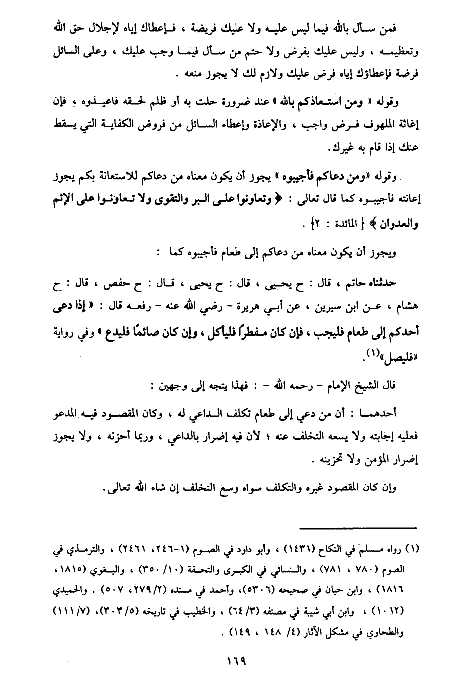 حَدَّثَنَاهُ حَاتِمٌ، قَالَ: ح يَحْيَى قَالَ: ح يَحْيَى قَالَ: ح حَفْصٌ قَالَ: ح هِشَامٌ، عَنِ ابْنِ سِيرِينَ، عَنْ أَبِي هُرَيْرَةَ رَضِيَ اللَّهُ عَنْهُ، رَفَعَهُ قَالَ: §«إِذَا دُعِيَ أَحَدُكُمْ إِلَى طَعَامٍ فَلْيُجِبْ، فَإِنْ كَانَ مُفْطِرًا فَلْيَأْكُلْ، وَإِنْ كَانَ صَائِمًا، فَلْيَدْعُ» ، وَفِي رِوَايَةٍ: «فَلْيُصَلِّ» قَالَ الشَّيْخُ الْإِمَامُ رَحِمَهُ اللَّهُ: فَهَذَا يَتَّجِهُ إِلَى وَجْهَيْنِ: أَحَدُهُمَا: أَنَّ مِنَ دُعِيَ إِلَى طَعَامٍ تَكَلَّفَ الدَّاعِي لَهُ، وَكَانَ الْمَقْصُودُ فِيهِ الْمَدْعُوَّ، فَعَلَيْهِ إِجَابَتُهُ، وَلَا يَسَعُهُ التَّخَلُّفُ عَنْهُ، لِأَنَّ فِيهِ إِضْرَارًا بِالدَّاعِي، وَرُبَّمَا أَحْزَنَهُ، وَلَا يَجُوزُ إِضْرَارُ الْمُؤْمِنِ، وَلَا تَحْزِينُهُ. وَإِنْ كَانَ الْمَقْصُودُ غَيْرَهُ، وَالتَّكَلُّفُ سِوَاهُ، وَسِعَ التَّخَلُّفُ، إِنْ شَاءَ اللَّهُ تَعَالَى