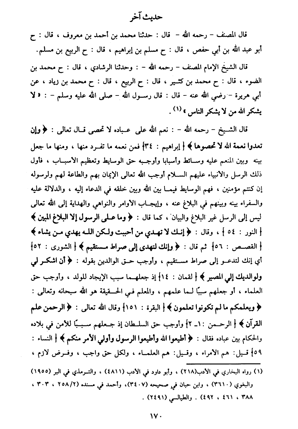 قَالَ الْمُصَنِّفُ رَحِمَهُ اللَّهِ قَالَ: حَدَّثَنَا مُحَمَّدُ بْنُ أَحْمَدَ بْنِ مَعْرُوفٍ قَالَ: ح أَبُو عَبْدِ اللَّهِ بْنُ أَبِي حَفْصٍ قَالَ: ح مُسْلِمُ بْنُ إِبْرَاهِيمَ قَالَ: ح الرَّبِيعُ بْنُ مُسْلِمٍ، قَالَ الشَّيْخُ الْإِمَامُ الْمُصَنِّفُ رَحِمَهُ اللَّهُ: وَحَدَّثَنَا الرَّشَادِيُّ قَالَ: ح مُحَمَّدُ بْنُ الضَّوْءِ قَالَ: ح مُحَمَّدُ بْنُ كَثِيرٍ قَالَ: ح الرَّبِيعُ قَالَ: ح مُحَمَّدُ بْنُ زِيَادٍ، عَنْ أَبِي هُرَيْرَةَ رَضِيَ اللَّهُ عَنْهُ قَالَ: قَالَ رَسُولُ اللَّهِ صَلَّى اللهُ عَلَيْهِ وَسَلَّمَ: «§لَا يَشْكُرُ اللَّهَ مَنْ لَا يَشْكُرُ النَّاسَ» قَالَ الشَّيْخُ رَحِمَهُ اللَّهُ: نِعَمُ اللَّهُ عَلَى عِبَادِهِ لَا تُحْصَى، قَالَ تَعَالَى: {وَإِنْ تَعُدُّوا نِعْمَةَ اللَّهِ لَا تُحْصُوهَا} [النحل: 18] ، فَمِنْ نِعَمِهِ مَا تَفَرَّدَ مِنْهَا، وَمِنْهَا مَا جَعَلَ بَيْنَهُ، وَبَيْنَ الْمُنْعِمِ عَلَيْهِ وَسَائِطَ، وَأَسْبَابًا، وَأَوْجَبَهُ حَقَّ الْوَسَايِطِ، وَتَعْظِيمَ الْأَسْبَابِ، فَأَوَّلُ ذَلِكَ الرُّسُلُ وَالْأَنْبِيَاءُ عَلَيْهِمُ السَّلَامُ، أَوْجَبَ اللَّهُ تَعَالَى الْإِيمَانَ بِهِمْ، وَالطَّاعَةَ لَهُمْ، وَلِرَسُولِهِ إِنْ كُنْتُمْ مُؤْمِنِينَ، فَهُمُ الْوَسَايِطُ فِيمَا بَيْنَ اللَّهِ، وَبَيْنَ خَلْقِهِ فِي الدُّعَاءِ إِلَيْهِ، وَالدَّلَالَةِ عَلَيْهِ، وَالسُّفَرَاءُ بَيْنَهُ وَبَيْنَهُمْ فِي الْبَلَاغِ عَنْهُ، وَإِيجَابِ الْأوَامِرِ، وَالنَّوَاهِي، وَالْهِدَايَةِ إِلَى اللَّهِ تَعَالَى , لَيْسَ إِلَى الرُّسُلِ غَيْرُ الْبَلَاغِ وَالْبَيَانِ، كَمَا قَالَ: {وَمَا عَلَى الرَّسُولِ إِلَّا الْبَلَاغُ الْمُبِينُ} [النور: 54] ، وَقَالَ: {إِنَّكَ لَا تَهْدِي مَنْ أَحْبَبْتَ وَلَكِنَّ الْلَّهَ يَهْدِي مَنْ يَشَاءُ} [القصص: 56] ثُمَّ قَالَ {وَإِنَّكَ لَتَهْدِي إِلَى صِرَاطٍ مُسْتَقِيمٍ} [الشورى: 52] ، أَيْ: إِنَّكَ لَتَدْعُو إِلَى صِرَاطٍ مُسْتَقِيمٍ، وَأَوْجَبَ حَقَّ الْوَالِدَيْنِ بِقَوْلِهِ {أَنِ اشْكُرْ لِي وَلِوَالِدَيْكَ إِلَيَّ الْمَصِيرُ} [لقمان: 14] ، إِذْ جَعَلَهُمَا سَبَبَ الْإِيجَادِ لِلْوَلَدِ، وَأَوْجَبَ حَقَّ الْعُلَمَاءِ، أَوْ جَعَلَهُمْ سَبَبًا لَمَّا عَلَّمَهُمْ، وَالْمُعَلِّمُ فِي الْحَقِيقَةِ هُوَ اللَّهُ سُبْحَانَهُ وَتَعَالَى: {وَيُعَلِّمُكُمْ مَا لَمْ تَكُونُوا تَعْلَمُونَ} [البقرة: 151] ، وَقَالَ اللَّهُ تَعَالَى: {الرَّحْمَنُ عَلَّمَ الْقُرْآنَ} [الرحمن: 2] ، وَأَوْجَبَ حَقَّ السُّلْطَانِ إِذْ جَعَلَهُمْ سَبَبًا لِلْأَمْنِ فِي بِلَادِهِ، وَالْحُكَّامَ بَيْنَ عِبَادِهِ، فَقَالَ: {أَطِيعُوا اللَّهَ وَأَطِيعُوا الرَّسُولَ وَأُولِي الْأَمْرِ مِنْكُمْ} [النساء: 59] ، قِيلَ: هُمُ الْأُمَرَاءُ، وَقِيلَ: هُمُ الْعُلَمَاءُ، وَلِكُلٍّ حَقٌّ وَاجِبٌ، وَفَرْضٌ لَازِمٌ -[171]-، فَكَذَلِكَ إِذَا أَنْعَمَ اللَّهُ تَعَالَى عَلَيْكَ بِوَاسِطَةِ عَبْدٍ مِنْ عِبَادِهِ فِي نَفْعٍ لَكَ أَوْ دَفْعٍ عَنْكَ، أَوْجَبَ عَلَيْكَ شُكْرَهُ، وَالْمُنْعِمُ فِي الْحَقِيقَةِ هُوَ اللَّهُ تَعَالَى، قَالَ اللَّهُ تَعَالَى {وَمَا بِكُمْ مِنْ نِعْمَةٍ فَمِنَ اللَّهِ} [النحل: 53] فَوَجَبَ عَلَيْهِ الشُّكْرُ لِلَّهِ تَعَالَى فِيمَا أَنْعَمَ بِهِ عَلَيْكَ، وَوَجَبَ عَلَيْكَ شُكْرُ مَنْ جَعَلَهُ سَبَبًا لِنِعْمَةِ النَّفْعِ وَالدَّفْعِ، كَالشُّكْرِ لِلَّهِ تَعَالَى، أَوَّلُهُ رُؤْيَةُ النِّعْمَةِ بِالْقَلْبِ مِنَ اللَّهِ تَعَالَى. قَالَ مُحَمَّدُ بْنُ عَلِيٍّ التِّرْمِذِيُّ رَحِمَهُ اللَّهُ: الشُّكْرُ انْكِشَافُ الْغِطَاءِ عَنِ الْقَلْبِ لِشُهُودِ النِّعْمَةِ، وَالْكَثِيرُ انْكِشَافُ الشَّفَتَيْنِ عَنِ الْأَسْنَانِ لِوُجُودِ الْفَرَجِ، فَالشُّكْرُ رُؤْيَةُ الْقَلْبِ النِّ