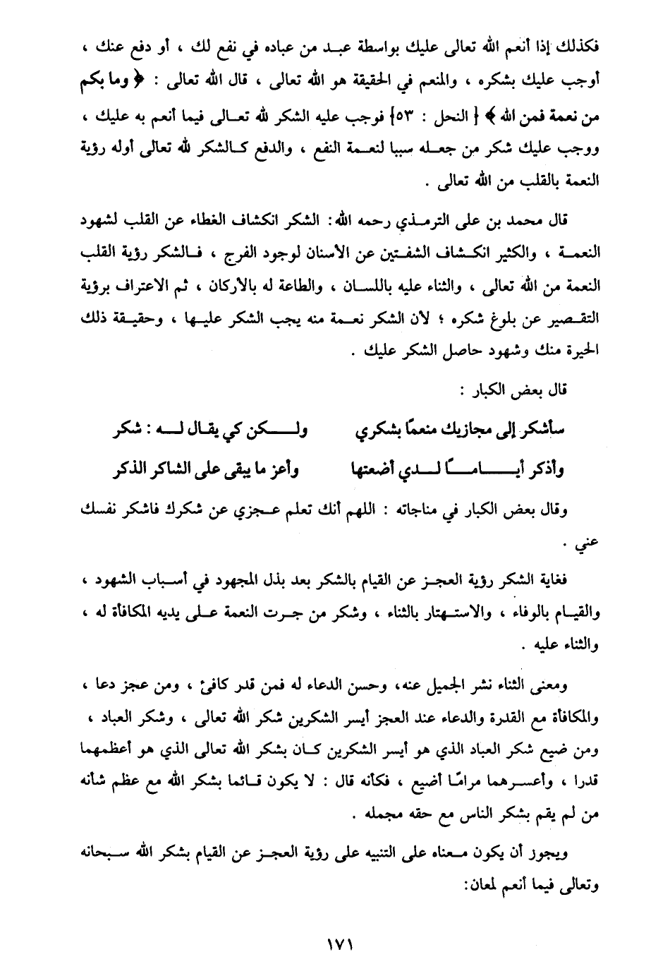 |قال بعض الكبار : % ( سأشكر إلى مجازيك منعما بشكري % ولكن كي يقال له : شكر ) % % ( وأذكر اياما لدي اضعتها % واعز ما يبقى على الشاكر الذكر ) % وقال بعض الكبار في مناجاته : اللهم انك تعلم عجزي عن شكرك فاشكر نفسك عني.
