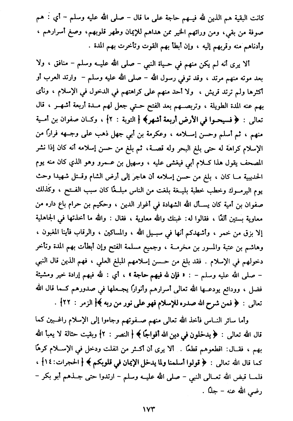 ، كَانَتِ الْبَقِيَّةُ هُمُ الَّذِينَ لِلَّهِ فِيهِمْ حَاجَةٌ عَلَى مَا قَالَ صَلَّى اللهُ عَلَيْهِ وَسَلَّمَ، أَيْ: هُمْ صَفْوَةُ مَنْ بَقِيَ، وَمِنْ وَرَائِهِمُ الْخَيْرُ مِمَّنْ هَدَاهُمْ لِلْإِيمَانِ، وَطَهَّرَ قُلُوبَهُمْ، وَصَفَّى أَسْرَارَهُمْ، وَأَدْنَاهُمْ مِنْهُ، وَقَرَّبَهُمْ إِلَيْهِ، وَإِنْ أَبْطَأَ بِهِمُ الْقُوتُ، وَتَأَخَّرَتْ بِهِمُ الْمُدَّةُ , أَلَا يَرَى أَنَّهُ لَمْ يَكُنْ مِنْهُمْ فِي حَيَاةِ النَّبِيِّ صَلَّى اللهُ عَلَيْهِ وَسَلَّمَ مُنَافِقٌ، وَلَا بَعْدَ مَوْتِهِ مِنْهُمْ مُرَتَدٌّ، وَقَدْ تُوُفِّيَ رَسُولُ اللَّهِ صَلَّى اللهُ عَلَيْهِ وَسَلَّمَ، وَارْتَدَّ الْعَرَبُ، أَوْ أَكْثَرُهَا، وَلَمْ تَرْتَدَّ قُرَيْشٌ، وَلَا أَحَدٌ مِنْهُمْ عَلَى كَرَاهَتِهِمْ فِي الدُّخُولِ فِي الْإِسْلَامِ، وَنَأَى بِهِمْ عَنْهُ الْمُدَّةَ الطَّوِيلَةَ، وَتَرَبَّصَهُمْ بَعْدَ الْفَتْحِ، حَتَّى جَعَلَ لَهُمْ مُدَّةَ أَرْبَعَةِ أَشْهُرٍ، قَالَ تَعَالَى: {فَسِيحُوا فِي الْأَرْضِ أَرْبَعَةَ أَشْهُرٍ} [التوبة: 2] ، وَكَانَ صَفْوَانُ بْنُ أُمَيَّةَ مِنْهُمْ، ثُمَّ أَسْلَمَ وَحَسُنَ إِسْلَامُهُ، وَعِكْرِمَةُ بْنُ أَبِي جَهْلٍ ذَهَبَ عَلَى وَجْهِهِ فِرَارًا مِنَ الْإِسْلَامِ، كَرَاهَةً لَهُ، حَتَّى بَلَغَ الْبَحْرَ، وَلَهُ قِصَّةٌ، ثُمَّ بَلَغَ مِنْ حُسْنِ إِسْلَامِهِ أَنَّهُ كَانَ إِذَا نَشَرَ الْمُصْحَفَ يَقُولُ: هَذَا كَلَامُ رَبِّي، فَيُغْشَى عَلَيْهِ، وَسُهَيْلُ بْنُ عَمْرٍو، وَهُوَ الَّذِي كَانَ مِنْهُ يَوْمَ الْحُدَيْبِيَةِ مَا كَانَ بَلَغَ مِنْ حُسْنِ إِسْلَامِهِ أَنْ هَاجَرَ إِلَى أَرْضِ الشَّامِ، وَقُتِلَ شَهِيدًا، وَحَثَّ يَوْمَ الْيَرْمُوكِ، وَخَطَبَ خُطْبَةً بَلِيغَةً بَلَغَتْ مِنَ النَّاسِ مُبَلِّغًا، كَانَ سَبَبَ الْفَتْحِ، وَكَذَلِكَ صَفْوَانُ بْنُ أُمَيَّةَ كَانَ يَسْأَلُ اللَّهَ الشَّهَادَةَ فِي أَغْوَارِ الدِّينِ، وَحَكِيمُ بْنُ حِرَامٍ بَاعَ دَارَهُ مِنْ مُعَاوِيَةَ بِسِتِّينَ أَلْفًا، فَقَالُوا لَهُ: غَبَنَكَ وَاللَّهِ مُعَاوِيَةُ، فَقَالَ: وَاللَّهِ مَا أَخَذْتُهَا فِي الْجَاهِلِيَّةِ إِلَّا بِزِقٍّ مِنْ خَمْرٍ، وَأُشْهِدُكُمْ أَنَّهَا فِي سَبِيلِ اللَّهِ، وَالْمَسَاكِينِ، وَالرِّقَابِ، فَأَيُّنَا الْمَغْبُونُ؟، وَهَاشِمُ بْنُ عُتْبَةَ، وَالْمِسْوَرُ بْنُ مَخْرَمَةَ، وَجَمِيعُ مَسْلَمَةِ الْفَتْحِ، وَإِنْ أَبْطَأَتْ بِهِمُ الْمُدَّةُ، وَتَأَخَّرَ دُخُولُهُمْ فِي الْإِسْلَامِ، فَقَدْ بَلَغَ مِنْ حُسْنِ إِسْلَامِهِمُ الْمَبْلَغَ الْعَلِيَّ، فَهُمُ الَّذِينَ قَالَ النَّبِيُّ صَلَّى اللهُ عَلَيْهِ وَسَلَّمَ: «فَإِنَّ لِلَّهِ فِيهِمْ حَاجَةً» ، أَيْ: لِلَّهِ فِيهِمْ إِرَادَةُ خَيْرٍ، وَمَشِيئَةُ فَضْلٍ، وَوَدَائِعُ يُودِعُهَا اللَّهُ تَعَالَى أَسْرَارَهُمْ، وَأَنْوَارًا يَجْعَلُهَا فِي صُدُورِهِمْ كَمَا قَالَ اللَّهُ تَعَالَى: {أَفَمَنْ شَرَحَ اللَّهُ صَدْرَهُ لِلْإِسْلَامِ فَهُوَ عَلَى نُورٍ مِنْ رَبِّهِ} [الزمر: 22] وَأَمَّا سَائِرُ النَّاسِ، فَأَخَذَ اللَّهُ تَعَالَى مِنْهُمْ صَفْوتَهُمْ، وَجَاءُوا إِلَى الْإِسْلَامِ رَاغِبِينَ كَمَا قَالَ اللَّهُ تَعَالَى: {يَدْخُلُونَ فِي دِينِ اللَّهِ أَفْوَاجًا} [النصر: 2] ، وَبَقِيَتْ حُثَالَةٌ لَا يَعْبَأُ اللَّهُ بِهِمْ، فَقَالَ: اقْطَعُوهُمْ قَطْعًا. أَلَا يُرَى أَنَّ أَكْثَرَ مَنِ انْفَلَتَ، وَدَخَلَ فِي الْإِسْلَامِ كَرْهًا كَمَا قَالَ اللَّهُ تَعَالَى: {قُولُوا أَسْلَمْنَا وَلَمَّا يَدْخُلِ الْإِيمَانُ فِي قُلُوبِكُمْ} [الحجرات: 14] ، فَلَمَّا قَبَضَ اللَّهُ تَعَالَى النَّبِيَّ صَلَّى اللهُ عَلَيْهِ وَسَلَّمَ، ارْتَدُّوا حَتَّى جَذَّهُمْ أَبُو بَكْرٍ رَضِيَ اللَّهُ عَنْهُ جَذًّا
