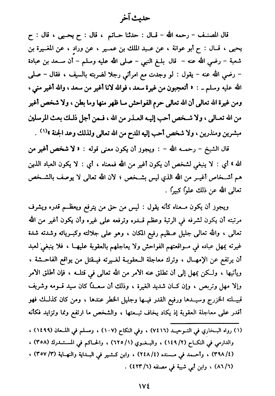 قَالَ الْمُصَنِّفُ رَحِمَهُ اللَّهُ قَالَ: حَدَّثَنَا حَاتِمٌ، قَالَ: ح يَحْيَى قَالَ: ح يَحْيَى قَالَ: ح أَبُو عَوَانَةَ، عَنْ عَبْدِ الْمَلِكِ بْنِ عُمَيْرٍ، عَنْ وَرَّادٍ، عَنِ الْمُغِيرَةِ بْنِ شُعْبَةَ رَضِيَ اللَّهُ عَنْهُ قَالَ: بَلَغَ النَّبِيَّ صَلَّى اللهُ عَلَيْهِ وَسَلَّمَ أَنَّ سَعْدَ بْنَ عُبَادَةَ رَضِيَ اللَّهُ عَنْهُ يَقُولُ: لَوْ وَجَدْتُ مَعَ امْرَأَتِي رَجُلًا لَضَرَبْتُهُ بِالسَّيْفِ، فَقَالَ صَلَّى اللهُ عَلَيْهِ وَسَلَّمَ: «§أَتَعْجَبُونَ مِنْ غَيْرَةِ سَعْدٍ، فَوَاللَّهِ لَأَنَا أَغْيَرُ مِنْ سَعْدٍ، وَاللَّهُ أَغْيَرُ مِنِّي، وَمِنْ غَيْرَةِ اللَّهِ تَعَالَى أَنَّ اللَّهَ تَعَالَى حَرَّمَ الْفَوَاحِشَ مَا ظَهَرَ مِنْهَا وَمَا بَطَنَ، وَلَا شَخَصَ أَغْيَرُ مِنَ اللَّهِ تَعَالَى، وَلَا شَخَصَ أَحَبُّ إِلَيْهِ الْعُذْرُ مِنَ اللَّهِ، فَمِنْ أَجْلِ ذَلِكَ بَعَثَ الْمُرْسَلِينَ مُبَشِّرِينَ، وَمُنْذِرِينَ، وَلَا شَخَصَ أَحَبُّ إِلَيْهِ الْمَدْحُ مِنَ اللَّهِ تَعَالَى، وَلِذَلِكَ وَعَدَ الْجَنَّةَ» قَالَ الشَّيْخُ رَحِمَهُ اللَّهُ: وَيَجُوزُ أَنْ يَكُونَ مَعْنَى قَوْلِهِ: «لَا شَخَصَ أَغْيَرُ مِنَ اللَّهِ» ، أَيْ: لَا يَنْبَغِي لِشَخْصٍ أَنْ يَكُونَ أَغْيَرَ مِنَ اللَّهِ، فَمَعْنَاهُ، أَيْ: لَا يَكُونُ الْعِبَادُ الَّذِينَ هُمْ أشخاصٌ أَغْيَرَ مِنَ اللَّهِ الَّذِي لَيْسَ بِشَخْصٍ؛ لِأَنَّ اللَّهَ تَعَالَى لَا يُوصَفُ بِالشَّخْصِ، تَعَالَى اللَّهُ عَنْ ذَلِكَ عُلُوًّا كَبِيرًا. وَيَجُوزُ أَنْ يَكُونَ مَعْنَاهُ كَأَنَّهُ يَقُولُ: لَيْسَ مِنْ حَقِّ مَنْ يَتَرَفَّعُ، وَيَعْظُمُ قَدْرُهُ، وَيَشْرُفُ مَرْتَبَتُهُ أَنْ يَكُونَ لِشَرَفِهِ فِي الرُّتْبَةِ، وَعِظَمِ قَدْرِهِ، وَتَرَفُّعِهِ عَلَى غَيْرِهِ، وَأَنْ يَكُونَ أَغْيَرَ مِنَ اللَّهِ تَعَالَى، وَاللَّهُ تَعَالَى جَلِيلٌ عَظِيمٌ، رَفِيعُ الْمَكَانِ، وَهُوَ عَلَى جَلَالَتِهِ وَكِبْرَيَائِهِ، وَشِدَّتِهِ شِدَّةِ غَيْرَتِهِ، يُمْهِلُ عِبَادَهُ فِي مُوَاقَعَتِهِمُ الْفَوَاحِشَ، وَلَا يُعَاجِلُهُمْ بِالْعُقُوبَةِ عَلَيْهَا، فَلَا يَنْبَغِي لِعَبْدٍ أَنْ يَرْتَفِعَ عَنِ الْإِمْهَالِ، وَتَرْكِ مُعَاجَلَةِ الْعُقُوبَةِ لِغَيْرَتِهِ، فَيَقْتُلَ مَنْ يُوَاقِعُ الْفَاحِشَةَ، وَيَأْتِيهَا، وَلَكِنْ يُمْهِلُ إِلَى أَنْ تُطْلَقَ عَنْهُ الْأَمْرُ مِنَ اللَّهِ تَعَالَى فِي قَتْلِهِ، فَإِنْ أَطْلَقَ الْأَمْرَ، وَإِلَّا مَهَّلَ وَتَرَبَّصَ، وَإِنْ كَانَ شَدِيدَ الْغَيْرَةِ، وَذَلِكَ أَنَّ سَعْدًا كَانَ سَيِّدَ قَوْمِهِ، وَشَرِيفَ قَبِيلَتِهِ الْخَزْرَجِ، وَسَيِّدَهَا، وَرَفِيعَ الْقَدْرِ فِيهَا، وَجَلِيلَ الْخَطَرِ عِنْدَهَا، وَمَنْ كَانَ كَذَلِكَ، فَهُوَ أَقْدَرُ عَلَى مُعَاجَلَةِ الْعُقُوبَةِ، إِذْ يَكَادُ يَخَافُ تَبِعَتَهَا، وَالشَّخْصُ مَا ارْتَفَعَ، وَنَمَا، وَتَزَايَدَ، فَكَأَنَّهُ -[175]- يَقُولُ: مَنْ كَانَ رِفْعَتُهُ، وَشَرَفُهُ، وَجَلَالَةُ قَدْرِهِ بِالنُّمُوِّ، وَالتَّزَايُدِ، وَالِارْتِفَاعِ مِنْ حَالَةِ الِانْخِفَاضِ، فَلَا يَنْبَغِي أَنْ يُجَاوِزَ الْحَدَّ الَّذِي حُدَّ لَهُ، وَالْوَقْتَ الَّذِي يَجُوزُ لَهُ أَنْ يُوَاقِعَ بِالْعُقُوبَةِ مَوَاقِعَ الْفَاحِشَةِ، فَإِنَّ اللَّهَ أَجَلُّ وَأَعْظَمُ، وَأَعْلَى جَلَالَتِهِ، وَعَظَمَتِهُ، وَعُلُوِّهِ، لَمْ يَزَلْ، وَلَا يَزَالُ، وَغَيْرَتُهُ أَشَدُّ، وَهُوَ مَعَ هَذَا يُمْهِلُ مُوَاقِعَ الْفَاحِشَةِ، وَلَا يُعَاجِلُهُ، فَالشَّخْصُ أَوْلَى بِتَرْكِ مُعَاجَلَةِ الْعُقُوبَةِ، الدَّلِيلُ عَلَى هَذَا التَّأْوِيلِ رِوَايَةُ أَبِي هُرَيْرَةَ رَضِيَ اللَّهُ عَنْهُ، وَهُوَ