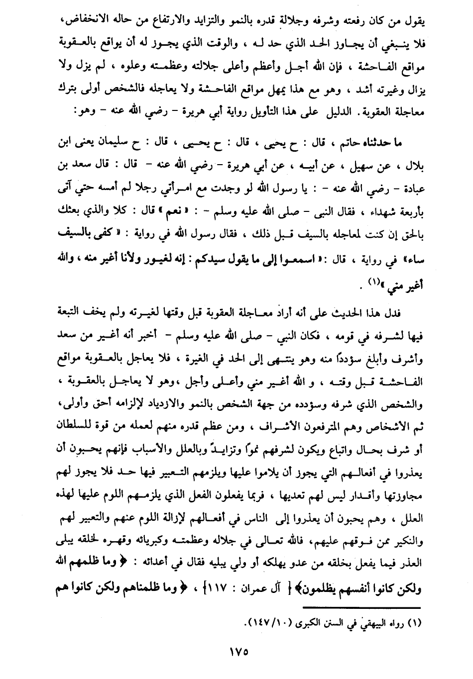 مَا حَدَّثَنَاهُ حَاتِمٌ، قَالَ: ح يَحْيَى قَالَ: ح يَحْيَى قَالَ: ح سُلَيْمَانُ يَعْنِي ابْنَ بِلَالٍ، عَنْ سُهَيْلٍ، عَنْ أَبِيهِ، عَنْ أَبِي هُرَيْرَةَ رَضِيَ اللَّهُ عَنْهُ قَالَ: قَالَ سَعْدُ بْنُ عُبَادَةَ، رَضِيَ اللَّهُ عَنْهُ: يَا رَسُولَ اللَّهِ لَوْ وَجَدْتُ مَعَ امْرَأَتِي رَجُلًا لَمْ أَمَسَّهُ حَتَّى آَتِيَ بِأَرْبَعَةِ شُهَدَاءَ؟ فَقَالَ النَّبِيُّ صَلَّى اللهُ عَلَيْهِ وَسَلَّمَ: «نَعَمْ» قَالَ: كَلَّا وَالَّذِي بَعَثَكَ بِالْحَقِّ إِنْ كُنْتُ لَمُعَاجِلُهُ بِالسَّيْفِ قَبْلَ ذَلِكَ، فَقَالَ رَسُولُ اللَّهِ فِي رِوَايَةٍ: «كَفَى بِالسَّيْفِ شَاهِدًا» فِي رِوَايَةٍ قَالَ: " §اسْمَعُوا إِلَى مَا يَقُولُ سَيِّدُكُمْ: إِنَّهُ لَغَيُورٌ، وَلَأَنَا أَغْيَرُ مِنْهُ، وَاللَّهُ أَغْيَرُ مِنِّي " فَدَلَّ هَذَا الْحَدِيثُ عَلَى أَنَّهُ أَرَادَ مُعَالَجَةَ الْعُقُوبَةِ قَبْلَ وَقْتِهَا لِغَيْرَتِهِ، وَلَمْ يَخْفِ التَّبِعَةَ فِيهَا لِشَرَفِهِ فِي قَوْمِهِ، فَكَانَ النَّبِيُّ صَلَّى اللهُ عَلَيْهِ وَسَلَّمَ أَخْبَرَ أَنَّهُ أَغْيَرُ مِنْ سَعْدٍ، وَأَشْرَفُ، وَأَبْلَغُ سُؤْدُدًا مِنْهُ، وَهُوَ يَنْتَهِي إِلَى الْحَدِّ فِي الْغَيْرَةِ، فَلَا يُعَاجِلُ بِالْعُقُوبَةِ مُوَاقِعَ الْفَاحِشَةِ قَبْلَ وَقْتِهَا، وَاللَّهُ أَغْيَرُ مِنِّي وَأَعْلَى وَأَجَلُّ، وَهُوَ لَا يُعَاجِلُ بِالْعُقُوبَةِ، وَالشَّخْصُ الَّذِي شَرَفُهُ وَسُؤْدُدُهُ مِنْ جِهَةِ الشَّخْصِ بِالنُّمُوِّ وَالِازْدِيَادِ لِإِلْزَامِهِ أَحَقُّ وَأَوْلَى، ثُمَّ الْأَشْخَاصُ وَهُمُ الْمُتَرَفِّعُونَ الْأَشْرَافُ، وَمَنْ عَظُمَ قَدْرُهُ مِنْهُمْ لِعَمَلِهِ مِنْ قُوَّةٍ لِلسُّلْطَانِ، أَوْ شَرَفٍ بِحَالٍ، وَاتِّبَاعٍ، وَيَكُونُ لِشَرَفِهِمْ نُمُوًّا، وَتَزَايُدًا، وَبِالْعِلَلِ، وَالْأَسْبَابِ، فَإِنَّهُمْ يُحِبُّونَ أَنْ يُعْذَرُوا مِنْ أَفْعَالِهِمُ الَّتِي يَجُوزُ أَنْ يُلَامُوا عَلَيْهَا، وَيَلْزَمُهُمُ التَّعْبِيرُ فِيهَا حَدًّا، فَلَا يَجُوزُ لَهُمْ مُجَاوَزَتُهَا، وَأَقْدَارٌ لَيْسَ لَهُمْ تَعَدِّيهَا، فَرُبَّمَا يَفْعَلُونَ الْفِعْلَ الَّذِي يَلْزَمُهُمُ اللَّوْمُ عَلَيْهَا لِهَذِهِ الْعِلَلِ، وَهُمْ يُحِبُّونَ أَنْ يُعْذِرُوا إِلَى النَّاسِ فِي أَفْعَالِهِمْ لِإِزَالَةِ اللَّوْمِ عَنْهُمْ، وَالتَّعْبِيرِ لَهُمْ، وَالنَّكِيرِ مِمَّنْ فَوْقَهُمْ عَلَيْهِمْ، فَاللَّهُ تَعَالَى فِي جَلَالِهِ، وَعَظَمَتِهِ، وَكِبْرَيَائِهِ، وَقَهْرِهِ لِخَلْقِهِ يُبْدِي الْعُذْرَ فِيمَا يَفْعَلُ بِخَلْقِهِ مِنْ عَدُوٍّ يُهْلِكُهُ، أَوْ وَلِيٍّ يُبْلِيهِ، فَقَالَ فِي أَعْدَائِهِ: {وَمَا ظَلَمَهُمُ اللَّهُ وَلَكِنْ كَانُوا أَنْفُسَهُمْ يَظْلِمُونَ} [النحل: 33] ، {وَمَا ظَلَمْنَاهُمْ وَلَكِنْ كَانُوا هُمُ -[176]- الظَّالِمِينَ} [الزخرف: 76] ، وَقَالَ: {ذَلِكَ جَزَيْنَاهُمْ بِبَغْيِهِمْ} [الأنعام: 146] ، وَأَشْبَاهُهُ كَثِيرٌ، وَقَالَ فِي أَوْلِيَائِهِ: {ثُمَّ صَرَفَكُمْ عَنْهُمْ لِيَبْتَلِيَكُمْ} [آل عمران: 152] الْآيَةَ، وَقَالَ تَعَالَى {وَأُوذُوا فِي سَبِيلِي} [آل عمران: 195] ، {وَلَا تَحْسَبَنَّ الَّذِينَ قُتِلُوا فِي سَبِيلِ اللَّهِ} [آل عمران: 169] ، وَقَالَ {إِنَّ الَّذِينَ جَاءُوا بِالْإِفْكِ عُصْبَةٌ مِنْكُمْ لَا تَحْسَبُوهُ شَرًّا لَكُمْ بَلْ هُوَ خَيْرٌ لَكُمْ} ، {وَمَا أَصَابَكُمْ يَوْمَ الْتَقَى الْجَمْعَانِ} [آل عمران: 166] ، فَهُوَ جَلَّ جَلَالُهُ وَعَزَّ يُبْدِي هَذِهِ الْأَعْذَارَ فِي فِعْلِهِ، وَقَدْ بَعَثَ الْأَنْبِيَاءَ مُبَشِّرِينَ وَمُنْذِرِينَ {لِئَلَّا يَكُونَ لِلنَّاسِ عَلَى اللَّهِ حُجَّةٌ بَعْدَ الرُّسُلِ} [النساء: 165] ، وَلِئَلَّا يَقُولُوا يَوْمَ الْقِيَامَةِ {إِنَّا كُنَّا عَنْ هَذَا غَافِلِينَ} [الأعر