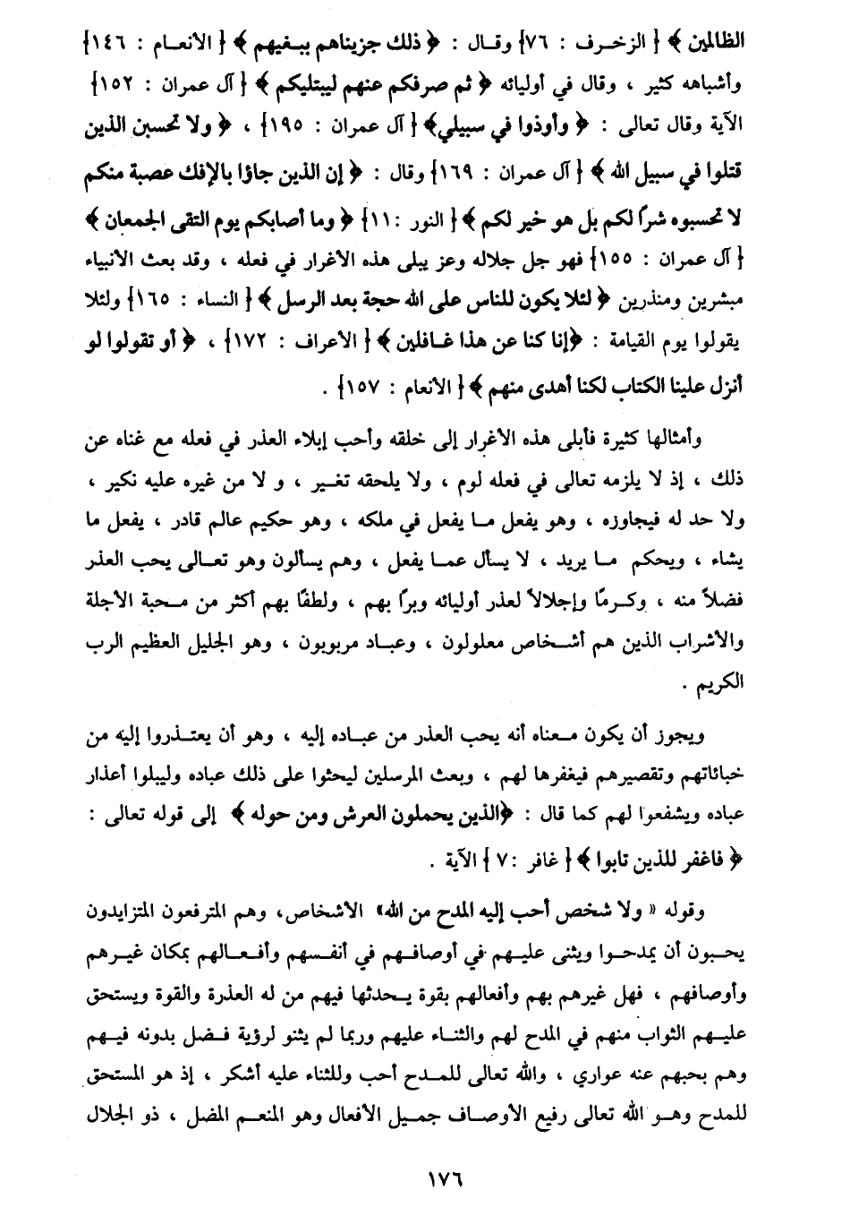 @ 176@الظالمين} [الزخرف : 76] وقال : {ذلك جزيناهم ببغيهم} [الأنعام : 146] واشباهه كثير ، وقال في أوليائه {ثم صرفكم عنهم ليبتليكم} [آل عمران : 152] الآية وقال تعالى : {وأوذوا في سبيلي} [آل عمران : 195] ، {ولا تحسبن الذين قتلوا في سبيل الله} [آل عمران : 169] وقال : {إن الذين جاؤا بالإفك عصبة منكم لا تحسبوه شرا لكم بل هو خير لكم} [النور : 11] {وما اصابكم يوم التقى الجمعان] [آل عمران : 155] فهو جل جلاله وعز يبلى هذه الاغرار في فعله ، وقد بعث الأنبياء مبشرين ومنذرين {لئلا يكون للناس على الله حجة بعد الرسل} [النساء : 165] ولئلا يقولوا يوم القيامة : {إنا كنا عن هذا غافلين} [الأعراف : 172] ، {أو تقولوا لو انزل علينا الكتاب لكنا اهدى منهم} [الأنعام : 157].