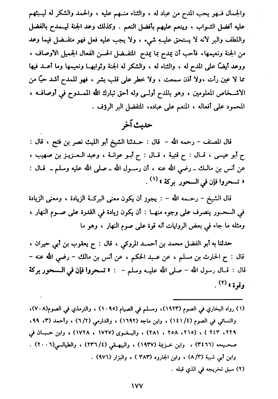 قَالَ الْمُصَنِّفُ رَحِمَهُ اللَّهُ قَالَ: حَدَّثَنَا الشَّيْخُ أَبُو اللَّيْثِ نَصْرُ بْنُ فَتْحٍ قَالَ: ح أَبُو عِيسَى قَالَ: ح قُتَيْبَةَ قَالَ: ح أَبُو عَوَانَةَ، وَعَبْدُ الْعَزِيزِ بْنُ صُهَيْبٍ، عَنْ أَنَسِ بْنِ مَالِكٍ، رَضِيَ اللَّهُ عَنْهُ، أَنَّ رَسُولَ اللَّهِ صَلَّى اللهُ عَلَيْهِ وَسَلَّمَ قَالَ: §«تَسَحَّرُوا؛ فَإِنَّ فِي السَّحُورِ بَرَكَةً» قَالَ الشَّيْخُ رَحِمَهُ اللَّهُ: يَجُوزُ أَنْ يَكُونَ مَعْنَى الْبَرَكَةِ الزِّيَادَةَ، وَمَعْنَى الزِّيَادَةِ فِي السَّحُورِ يَنْصَرِفُ عَلَى وُجُوهٍ مِنْهَا: أَنْ يَكُونَ زِيَادَةً فِي الْقُدْرَةِ عَلَى صَوْمِ النَّهَارِ، وَمِثْلُهُ مَا جَاءَ فِي بَعْضِ الرِّوَايَاتِ أَنَّهُ قُوَّةٌ عَلَى صَوْمِ النَّهَارِ وَهُوَ مَا