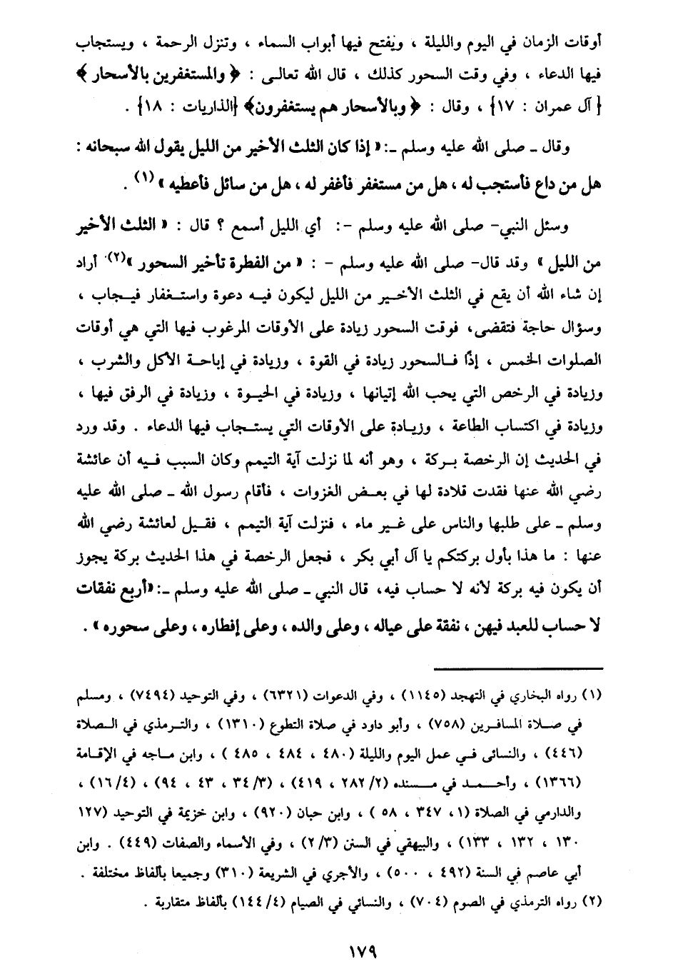 @ 179@أوقات الزمان في اليوم والليلة ، ويفتح فيها أبواب السماء ، وتنزل الرحمة ، ويستجاب فيها الدعاء ، وفي وقت السحور كذلك ، قال الله تعالى : {والمستغفرين بالأسحار} [آل عمران : 17] ، وقال : {وبالأسحار هم يستغفرون} [الذاريات : 18].