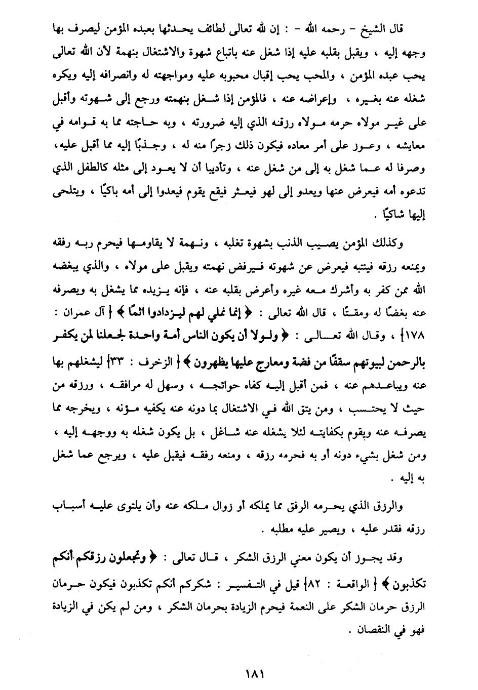 |وكذلك المؤمن يصيب الذنب بشهوة تغلبه ، ونهمة لا يقاومها فيحرم ربه رفقه ويمنعه رزقه فينتبه فيعرض عن شهوته فيرفض نهمته ويقبل على مولاه ، والذي يبغضه الله ممن كفر به واشرك معه غيره واعرض بقلبه عنه ، فإنه يزيده مما يشغل به ويصرفه عنه بغضا له ومقتا ، قال الله تعالى : {إنما نملي لهم ليزدادوا اثما} [آل عمران : 178] ، وقال الله تعالى : {ولولا أن يكون الناس أمة واحدة لجعلنا لمن يكفر بالرحمن لبيوتهم سقفا من فضة ومعارج عليها يظهرون} [الزخرف : 33] ليشغلهم بها عنه ويباعدهم عنه ، فمن اقبل إليه كفاه حوائجه ، وسهل له مرافقه ، ورزقه من حيث لا يحتسب ، ومن يتق الله في الأشغال بما دونه عنه يكفيه مؤنة ، ويخرجه مما يصرفه عنه ويقوم بكفايته لئلا يشغله عنه شاغل ، بل يكون شغله به ووجهه إليه ، ومن شغل بشيء دونه أو به فحرمه رزقه ، ومنعه رفقه فيقبل عليه ، ويرجع عما شغل به إليه.