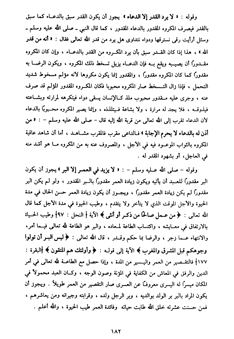 |وقوله صلى الله عليه وسلم : لا يزيد في العمر إلا البر يجوز أن يكون البر مقدورا للعبد أن يأتيه ويكون زيادة العمر مقدورا بالبر المقدور ، ولو لم يكن البر مقدورا لم يكن زيادة العمر مقدورا ، ويجوز أن يكون زيادة العمر حسن الحال في مدة الحيوة والاجل الموقت الذي لا يتأخر ولا يتقدم ، وطيب الحيوة في مدة الأجل كما قال الله تعالى : {من عمل صالحا من ذكر أو أنثى} الآية [النحل : 97] وطيب الحياة بالارتفاق في معايشة ، واكتساب الطاعة لمعاده ، والبر هو الطاعة لله تعالى فيما امر ، والانتهاء عما زجر ، والرضا بما حكم وقدر ، قال الله تعالى : {ليس البر أن تولوا وجوهكم قبل المشرق والمغرب} الآية إلى قوله : {وأولئك هم المتقون} [البقرة : 177] فالتقصير من العمر واليسير من المدة ، وإذا حصل مع الطاعة لله تعالى في أمر الدين والرفق في المعاش من الكفاية في المؤنة وصون الوجه ، وكان العبد محمولا في المكان ميسرا له اليسرى معروفا عن العسرى صار التقصير من العمر طويلا . ويجوز أن يكون المراد بالبر بر الولد بوالديه ، وبر الرجل ولده ، وقرابته وجيرانه ومن يعاشرهم ، فمن حسنت عشرته خلق الله طابت حياته وفائدة العمر طيب الحيوة ، والله أعلم.