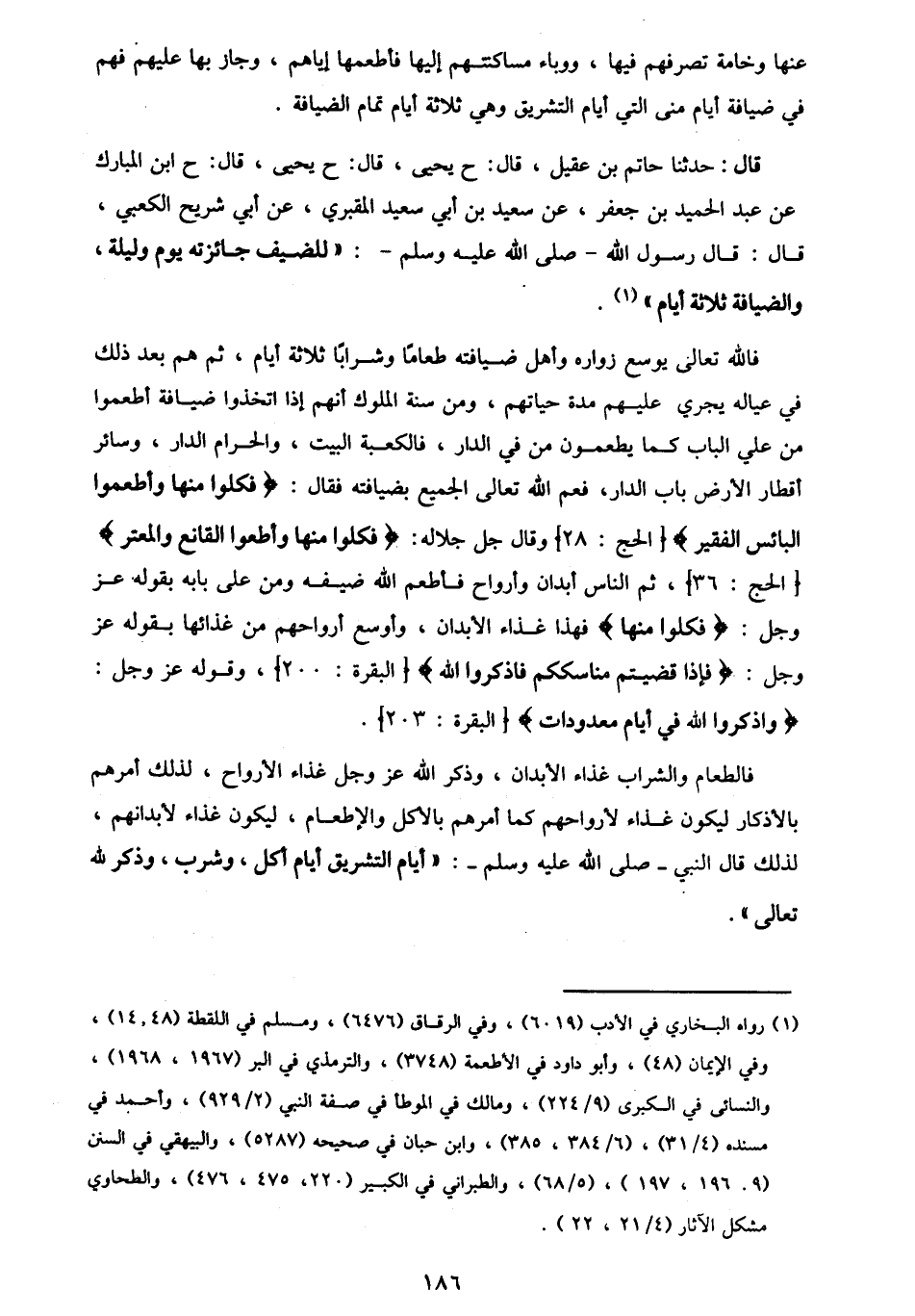 قَالَ: حَدَّثَنَا حَاتِمُ بْنُ عَقِيلٍ، قَالَ: ح يَحْيَى قَالَ: ح يَحْيَى قَالَ: ح ابْنُ الْمُبَارَكِ، عَنْ عَبْدِ الْحَمِيدِ بْنِ جَعْفَرٍ، عَنْ سَعِيدِ بْنِ أَبِي سَعِيدٍ الْمَقْبُرِيِّ، عَنْ أَبِي شُرَيْحٍ الْكَعْبِيِّ قَالَ: قَالَ رَسُولُ اللَّهِ صَلَّى اللهُ عَلَيْهِ وَسَلَّمَ: «§لِلضَّيْفُ جَائِزَتُهُ يَوْمٌ وَلَيْلَةٌ، وَالضِّيَافَةُ ثَلَاثَةُ أَيَّامٍ» فَاللَّهُ تَعَالَى يُوسِعُ زُوَّارَهُ وَأَهْلَ ضِيَافَتِهِ طَعَامًا وَشَرَابًا ثَلَاثَةَ أَيَّامٍ، ثُمَّ هُمْ بَعْدَ ذَلِكَ فِي عِيَالِهِ يُجْرِي عَلَيْهِمْ مُدَّةَ حَيَاتِهِمْ، وَمِنْ سُنَّةِ الْمُلُوكِ أَنَّهُمْ إِذَا اتَّخَذُوا ضِيَافَةً أَطْعَمُوا مَنْ عَلَى الْبَابِ، كَمَا يُطْعِمُونَ مَنْ فِي الدَّارِ، فَالْكَعْبَةُ الْبَيْتُ، وَالْحَرَمُ الدَّارُ، وَسَائِرُ أَقْطَارِ الْأَرْضِ بَابُ الدَّارِ، فَعَمَّ اللَّهُ تَعَالَى الْجَمِيعَ بِضِيَافَتِهِ، فَقَالَ {فَكُلُوا مِنْهَا وَأَطْعِمُوا الْبَائِسَ الْفَقِيرَ} [الحج: 28] ، وَقَالَ جَلَّ جَلَالُهُ {فَكُلُوا مِنْهَا وَأَطْعِمُوا الْقَانِعَ وَالْمُعْتَرَّ} [الحج: 36] ، ثُمَّ النَّاسُ أَبْدَانٌ وَأَرْوَاحٌ، فَأَطْعَمَ اللَّهُ ضَيْفَهُ، وَمَنْ عَلَى بَابِهِ بِقَوْلِهِ عَزَّ وَجَلَّ {فَكُلُوا مِنْهَا} [الحج: 28] ، فَهَذَا غِذَاءُ الْأَبْدَانِ، وَأَوْسَعَ أَرْوَاحَهُمْ مِنْ غِذَائِهَا بِقَوْلِهِ عَزَّ وَجَلَّ {فَإِذَا قَضَيْتُمْ مَنَاسِكَكُمْ فَاذْكُرُوا اللَّهَ} [البقرة: 200] ، وَقَوْلُهُ عَزَّ وَجَلَّ {وَاذْكُرُوا اللَّهَ فِي أَيَّامٍ مَعْدُودَاتٍ} [البقرة: 203] فَالطَّعَامُ وَالشَّرَابُ غِذَاءُ الْأَبْدَانِ، وَذِكْرُ اللَّهِ عَزَّ وَجَلَّ غِذَاءُ الْأَرْوَاحِ، لِذَلِكَ أَمَرَهُمْ بِالْأَذْكَارِ لِيَكُونَ غِذَاءً لِأَرْوَاحِهِمْ، كَمَا أَمَرَهُمْ بِالْأَكْلِ وَالْإِطْعَامِ لِيَكُونَ غِذَاءً لِأَبْدَانِهِمْ، لِذَلِكَ قَالَ النَّبِيُّ صَلَّى اللهُ عَلَيْهِ وَسَلَّمَ: «أَيَّامُ التَّشْرِيقِ أَيَّامُ أَكْلٍ وَشُرْبٍ وَذِكْرِ اللَّهِ تَعَالَى»
