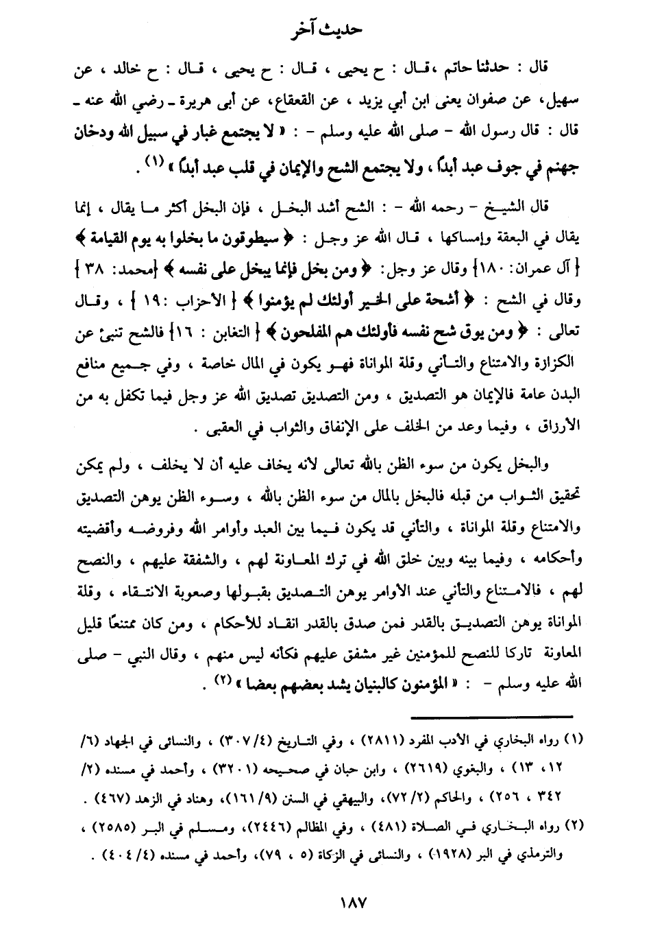 قَالَ: حَدَّثَنَا حَاتِمٌ، قَالَ: ح يَحْيَى قَالَ: ح يَحْيَى قَالَ: ح خَالِدٌ، عَنْ سُهَيْلٍ، عَنْ صَفْوَانَ يَعْنِي ابْنَ أَبِي يَزِيدَ، عَنِ الْقَعْقَاعِ، عَنْ أَبِي هُرَيْرَةَ رَضِيَ اللَّهُ عَنْهُ قَالَ: قَالَ رَسُولُ اللَّهِ صَلَّى اللهُ عَلَيْهِ وَسَلَّمَ: §«لَا يَجْتَمِعُ غُبَارٌ فِي سَبِيلِ اللَّهِ وَدُخَانُ جَهَنَّمَ فِي جَوْفِ عَبْدٍ أَبَدًا، وَلَا يَجْتَمِعُ الشُّحُّ وَالْإِيمَانُ فِي قَلْبِ عَبْدٍ أَبَدًا» قَالَ الشَّيْخُ رَحِمَهُ اللَّهُ: الشُّحُّ أَشَدُّ الْبُخْلِ، فَإِنَّ الْبُخْلَ أَكْثَرُ مَا يُقَالُ إِنَّمَا يُقَالُ فِي الْبَعْقَةِ وَإِمْسَاكِهَا، قَالَ اللَّهُ عَزَّ وَجَلَّ {سَيُطَوَّقُونَ مَا بَخِلُوا بِهِ يَوْمَ الْقِيَامَةِ} [آل عمران: 180] ، وَقَالَ عَزَّ وَجَلَّ {وَمَنْ يَبْخَلْ فَإِنَّمَا يَبْخَلُ عَنْ نَفْسِهِ} [محمد: 38] ، وَقَالَ فِي الشُّحِّ {أَشِحَّةً عَلَى الْخَيْرِ أُولَئِكَ لَمْ يُؤْمِنُوا} [الأحزاب: 19] ، وَقَالَ تَعَالَى {وَمَنْ يُوقَ شُحَّ نَفْسِهِ فَأُولَئِكَ هُمُ الْمُفْلِحُونَ} [الحشر: 9] ، فَالشُّحُّ تُنْبِئُ عَنِ الْكَزَازَةِ وَالِامْتِنَاعِ وَالتَّأَنِّي وَقِلَّةِ الْمُوَانَاةِ، فَهُوَ يَكُونُ فِي الْمَالِ خَاصَةً، وَفِي جَمِيعِ مَنَافِعِ الْبَدَنِ عَامَّةً، فَالْإِيمَانُ هُوَ التَّصْدِيقُ، وَمِنَ التَّصْدِيقِ تَصْدِيقُ اللَّهِ عَزَّ وَجَلَّ فِيمَا تَكَفَّلَ بِهِ مِنَ الْأَرْزَاقِ، وَفِيمَا وَعَدَ مِنَ الْخَلَفِ عَلَى الْإِنْفَاقِ، وَالثَّوَابِ فِي الْعُقْبَى. وَالْبُخْلُ يَكُونُ مِنْ سُوءِ الظَّنِّ بِاللَّهِ تَعَالَى؛ لِأَنَّهُ يَخَافُ عَلَيْهِ أَنْ لَا يَخْلُفَ، وَلَمْ يُمْكِنْ تَحْقِيقُ الثَّوَابُ مِنْ قِبَلِهِ، فَالْبُخْلُ بِالْمَالِ مِنْ سُوءِ الظَّنِّ بِاللَّهِ، وَسُوءُ الظَّنِّ يُوهِنُ التَّصْدِيقَ وَالِامْتِنَاعَ وَقِلَّةَ الْمُوَانَاةِ، وَالتَّأَنِّي قَدْ يَكُونُ فِيمَا بَيْنَ الْعَبْدِ وَأَوَامِرِ اللَّهِ وَفُرُوضِهِ وَأَقْضِيَتِهِ وَأَحْكَامِهِ، وَفِيمَا بَيْنَهُ وَبَيْنَ خَلْقِ اللَّهِ فِي تَرْكِ الْمُعَاوَنَةِ لَهُمْ، وَالشَّفَقَةِ عَلَيْهِمْ، وَالنُّصْحِ لَهُمْ، فَالِامْتِنَاعُ وَالتَّأَنِّي عِنْدَ الْأَوَامِرِ يُوهِنُ التَّصْدِيقَ بِقُبُولِهَا وَصُعُوبَةِ الِانْتِقَاءِ، وَقِلَّةُ الْمُوَانَاةِ يُوهِنُ التَّصْدِيقَ بِالْقَدَرِ، فَمَنْ صَدَّقَ بِالْقَدَرِ انْقَادَ لِلْأَحْكَامِ، وَمَنْ كَانَ مُمْتَنِعًا قَلِيلَ الْمُعَاوَنَةِ تَارِكًا لِلنُّصْحِ لِلْمُؤْمِنِينَ غَيْرَ مُشْفِقٍ عَلَيْهِمْ فَكَأَنَّهُ لَيْسَ مِنْهُمْ، وَقَالَ النَّبِيُّ صَلَّى اللهُ عَلَيْهِ وَسَلَّمَ: «الْمُؤْمِنُونَ كَالْبُنْيَانِ يَشُدُّ بَعْضُهُمْ بَعْضًا» -[188]-. وَقَالَ صَلَّى اللهُ عَلَيْهِ وَسَلَّمَ: «وَاللَّهِ لَا تُؤْمِنُونَ حَتَّى تَحَابُّوا» ، فَالشُّحُّ مِنْ جَمِيعِ وُجُوهِهِ يُخَالِفُ الْإِيمَانَ وَحَقِيقَتَهُ، فَلِذَلِكَ قَالَ صَلَّى اللهُ عَلَيْهِ وَسَلَّمَ: «لَا يَجْتَمِعُ الشُّحُّ وَالْإِيمَانُ فِي قَلْبِ عَبْدٍ أَبَدًا» ، وَالْمَعْنَى فِي الْإِيمَانِ حَقِيقَةُ الْإِيمَانِ الَّذِي هُوَ حَقُّهُ وَمُوجِبُهُ كَمَا أَخْبَرَ حَارِثَةُ عَنْ نَفْسِهِ مِنْ حَقِيقَةِ الْإِيمَانِ، وَتَمَكُّنِ التَّصْدِيقِ مِنْ قَلْبِهِ بِمَا أَخْبَرَ الْلَّهُ تَعَالَى عَنْهُ حَتَّى صَارَ كَأَنَّهُ يُشَاهِدُهُ شُهَودَ عَيَانٍ، فَمَنْ تَحَقَّقَ فِي إِيمَانِهِ، وَصَدَّقَ بِإِيقَانِهِ سَهُلَ عَلَيْهِ تَرْكُ الدُّنْيَا وَالْعُزُوفُ عَنْهَا، كَمَا قَالَ النَّبِيُّ صَلَّى اللهُ عَلَيْهِ وَسَلَّمَ فِي قَوْلِهِ عَزَّ وَجَلَّ {أَفَمَنْ شَرَحَ اللَّهُ صَدْرَهُ لِلْإِسْلَامِ فَهُوَ عَلَى نُورٍ مِنْ رَبِّهِ} [الزمر: 22] ، وَقَالَ النَّبِيُّ صَلَّى اللهُ عَ
