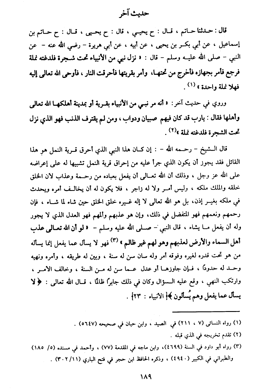 قَالَ: حَدَّثَنَا حَاتِمٌ، قَالَ: ح يَحْيَى قَالَ: ح يَحْيَى قَالَ: ح حَاتِمُ بْنُ إِسْمَاعِيلَ، عَنْ أَبِي بَكْرِ بْنِ يَحْيَى، عَنْ أَبِيهِ، عَنْ أَبِي هُرَيْرَةَ رَضِيَ اللَّهُ عَنْهُ، عَنِ النَّبِيِّ صَلَّى اللهُ عَلَيْهِ وَسَلَّمَ قَالَ: «§نَزَلَ نَبِيٌّ مِنَ الْأَنْبِيَاءِ تَحْتَ شَجَرَةٍ فَلَدَغَتْهُ نَمْلَةٌ، فَرَجَعَ، فَأَمَرَ بِجَهَازِهِ، فَأُخْرِجَ مِنْ تَحْتِهَا، وَأَمَرَ بِقَرْيَتِهَا فَأُحْرِقَتْ بِالنَّارِ، فَأَوْحَى اللَّهُ تَعَالَى إِلَيْهِ فَهَلَّا نَمْلَةٌ وَاحِدَةٌ» وَرُوِيَ فِي حَدِيثٍ آخَرَ: " أَنَّهُ مَرَّ نَبِيٌّ مِنَ الْأَنْبِيَاءِ بِقَرْيَةٍ أَوْ بِمَدِينَةٍ أَهْلَكَهَا اللَّهُ تَعَالَى وَأَهْلَهَا، فَقَالَ: يَا رَبِّ، قَدْ كَانَ فِيهِمْ صِبْيَانٌ وَدَوَابُّ، وَمَنْ لَمْ يَقْتَرِفِ الذَّنْبَ، فَهُوَ الَّذِي نَزَلَ تَحْتَ الشَّجَرَةِ، فَلَدَغَتْهُ نَمْلَةٌ ". قَالَ الشَّيْخُ رَحِمَهُ اللَّهُ: إِنْ كَانَ هَذَا النَّبِيُّ الَّذِي أَحْرَقَ قَرْيَةَ النَّمْلِ هُوَ هَذَا الْقَائِلَ، فَقَدْ يَجُوزُ أَنْ يَكُونَ الَّذِي جَرَأَ عَلَيْهِ مِنْ إِحْرَاقِ قَرْيَةِ النَّمْلِ تَشْبِيهًا لَهُ عَلَى إِعْرَاضِهِ عَلَى اللَّهِ عَزَّ وَجَلَّ، وَذَلِكَ أَنَّ اللَّهَ تَعَالَى أَنْ يَفْعَلَ بِعِبَادِهِ مِنْ رَحْمَةٍ وَعَذَابٍ، لِأَنَّ الْخَلْقَ خَلْقُهُ، وَالْمُلْكَ مُلْكُهُ، وَلَيْسَ آمِرٌ وَلَا لَهُ زَاجِرٌ، فَلَا يَكُونُ لَهُ أَنْ يُخَالِفَ أَمْرَهُ، وَيُحْدِثَ فِي مُلْكِهِ بِغَيْرِ إِذْنٍ، بَلْ هُوَ اللَّهُ تَعَالَى لَا إِلَهَ غَيْرُهُ، خَلَقَ الْخَلْقَ حِينَ شَاءَ لِمَا شَاءَ، فَإِنْ رَحِمَهُمْ وَنَعَّمَهُمْ، فَهُوَ الْمُتَفَضِّلُ فِي ذَلِكَ، وَإِنْ هُوَ عَذَّبَهُمْ وَأَلَّمَهُمْ فَهُوَ الْعَدْلُ الَّذِي لَا يَجُورُ، وَلَهُ أَنْ يَفْعَلَ مَا يَشَاءُ، قَالَ النَّبِيُّ صَلَّى اللهُ عَلَيْهِ وَسَلَّمَ: «لَوْ أَنَّ اللَّهَ تَعَالَى عَذَّبَ أَهْلَ السَّمَاءِ وَالْأَرْضِ لَعَذَّبَهُمْ، وَهُوَ لَهُمْ غَيْرُ ظَالِمٍ» ، فَهُوَ لَا يُسْأَلُ عَمَّا يَفْعَلُ إِنَّمَا يَسْأَلُهُ مَنْ هُوَ تَحْتَ قَدْرِهِ لِغَيْرِهِ، وَفَوْقَهُ أَمْرٌ وَلَهُ سَانٌّ سَنَّ لَهُ سُنَّةً، وَبَيَّنَ لَهُ طَرِيقَهُ، وَأَمْرَهُ وَنَهْيَهُ، وَحَّدَ لَهُ حُدُودًا، فَإِنْ جَاوَزَهَا أَوْ عَدَلَ عَمَّا سُنَّ لَهُ مِنَ السُّنَّةِ وَخَالَفَ الْأَمْرَ، وَارْتَكَبَ النَّهْيَ، وَقَعَ عَلَيْهِ السُّؤَالُ، وَكَانَ فِي ذَلِكَ جَائِرًا ظَالِمًا، قَالَ اللَّهُ تَعَالَى {لَا يُسْأَلُ عَمَّا يَفْعَلُ وَهُمْ يَسْأَلُونَ} [الأنبياء: 23]